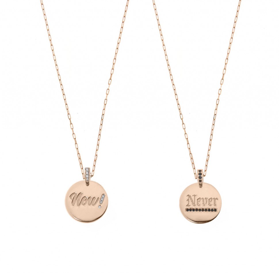 Collana donna, lunga 55 cm, Rue Des Mille. In argento 925 bagnato oro rosa 18 Kt. La collana da un lato presenta la scritta "Never" con zirconi neri e dall'altro presenta la scritta "Now!" con zirconi bianchi.