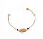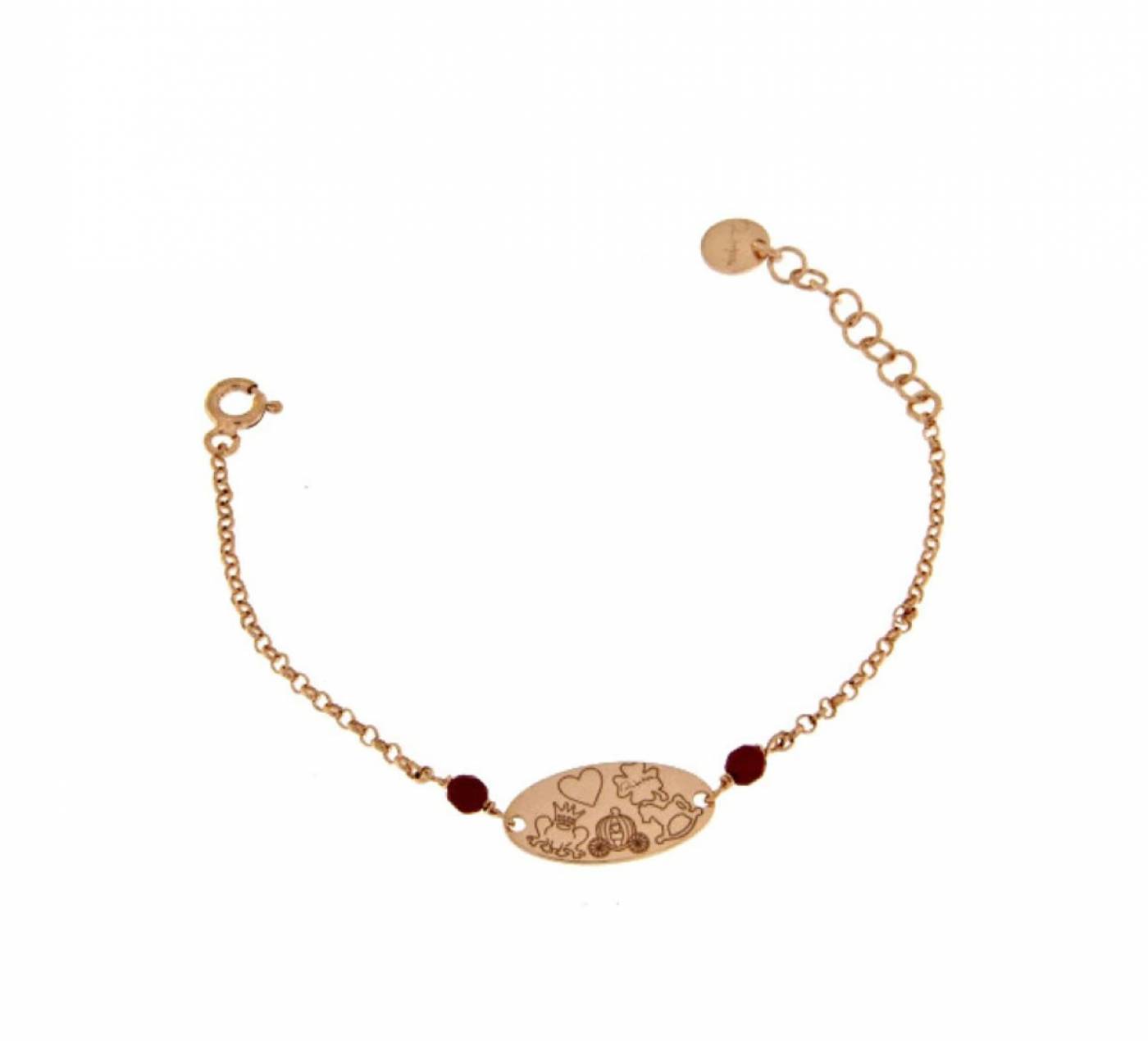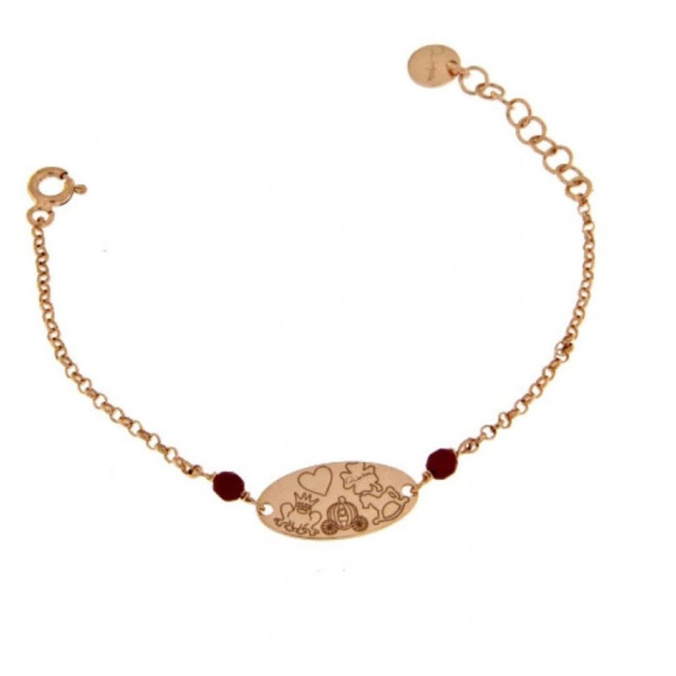 Bracciale neonato, lungo 14 cm, Rue Des Mille. In argento 925 bagnato oro rosa 18 kt e pietre rosse.