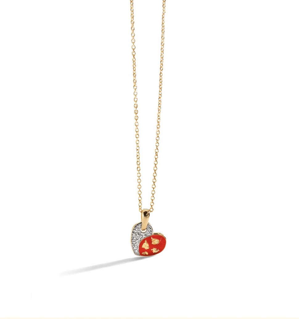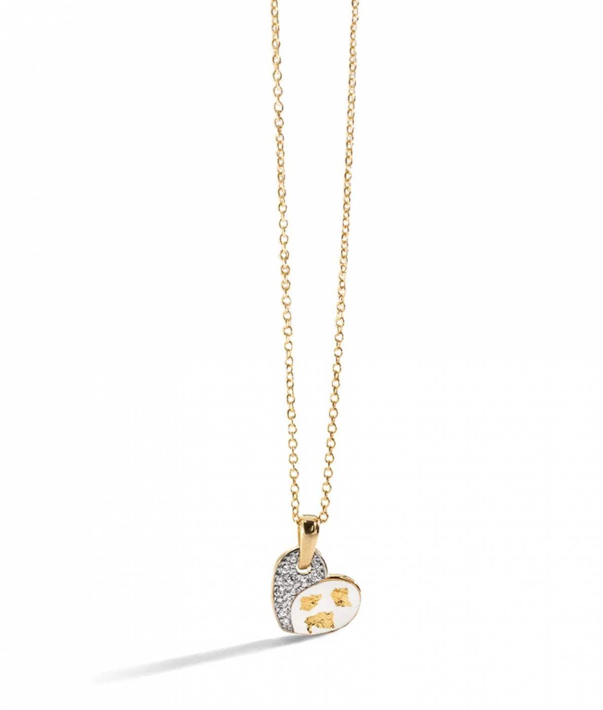 Collana donna, lunga 42 cm, Rue Des Mille. In argento 925 bagnato oro giallo 18 Kt. Il pendente ha zirconi su una metà del cuore, e smalto con foglia oro sull'altra metà.