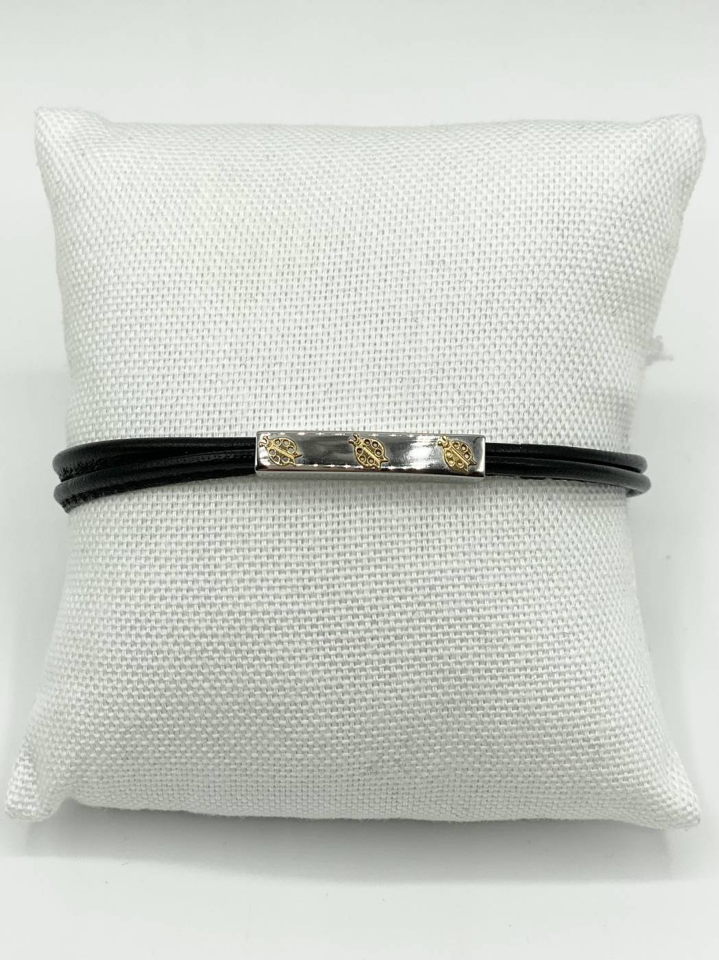 Bracciale donna Nomination con cordino nero in pelle regolabile e placca in acciaio inossidabile. Sulla placca centrale sono raffigurate 3 coccinelle in oro giallo 18 Kt.