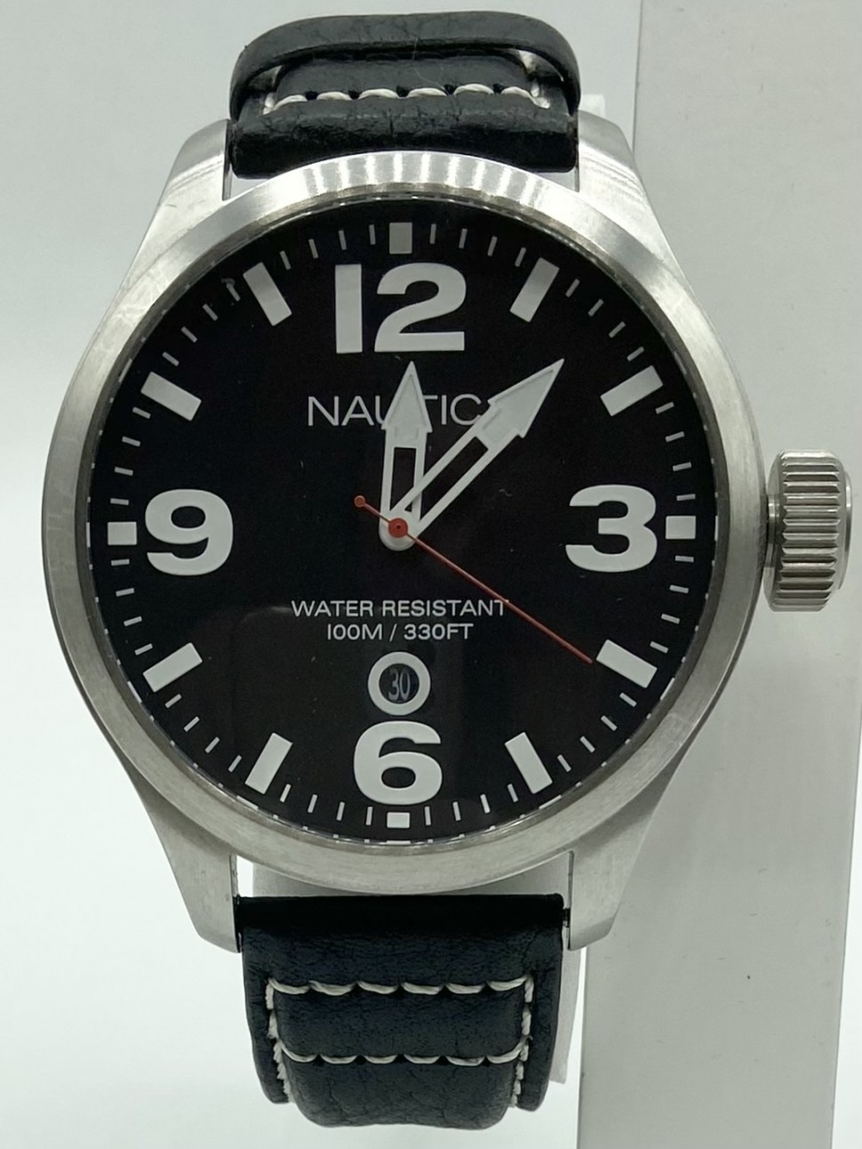 Orologio Uomo Nautica con cinturino in pelle nera e cassa in acciaio. Movimento al quarzo. Resistente all'acqua 100M/330FT.