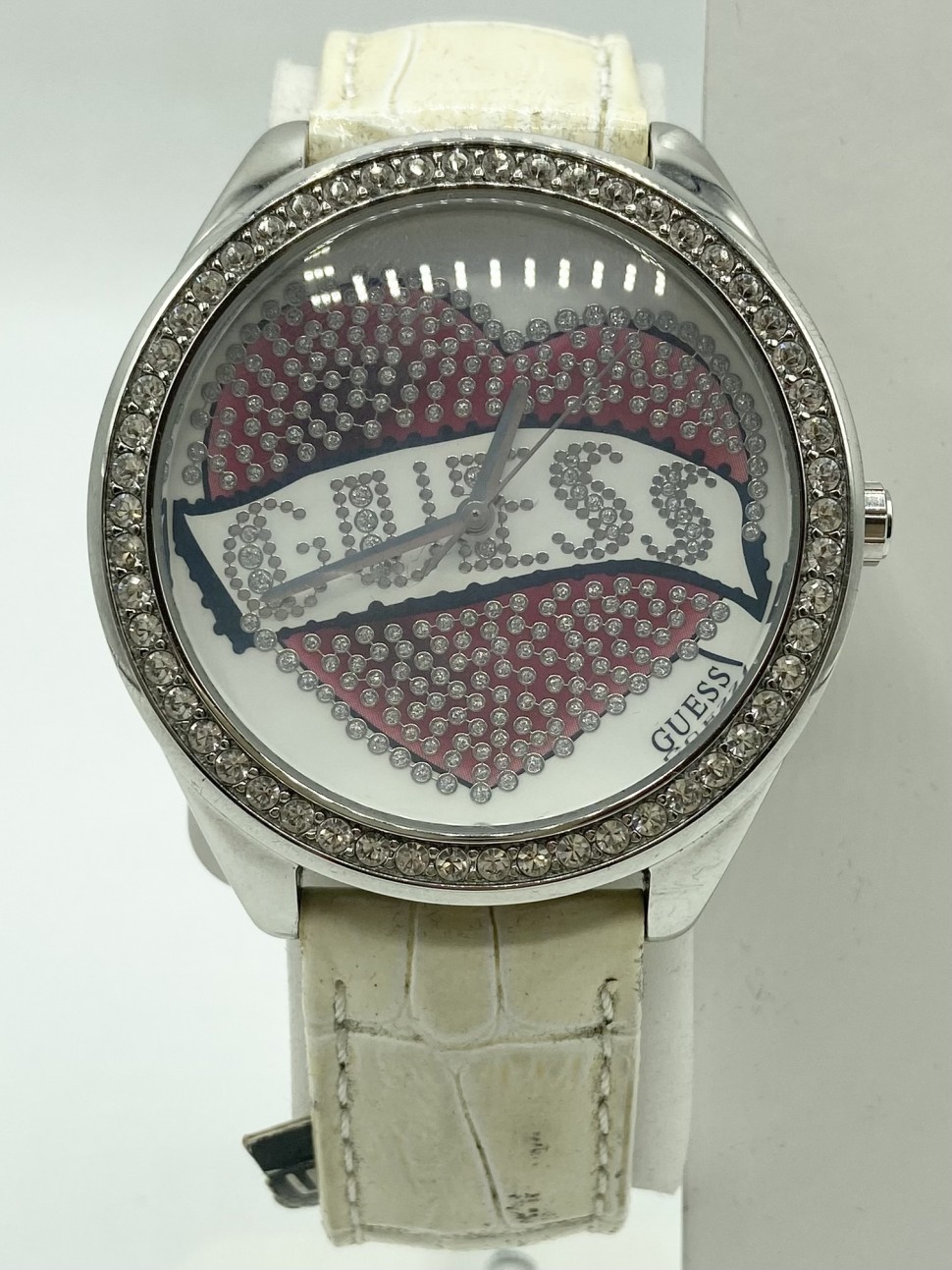 Orologio donna Guess con cinturino in pelle color crema e cassa in acciaio con quadrante di zirconi. Movimento al quarzo.