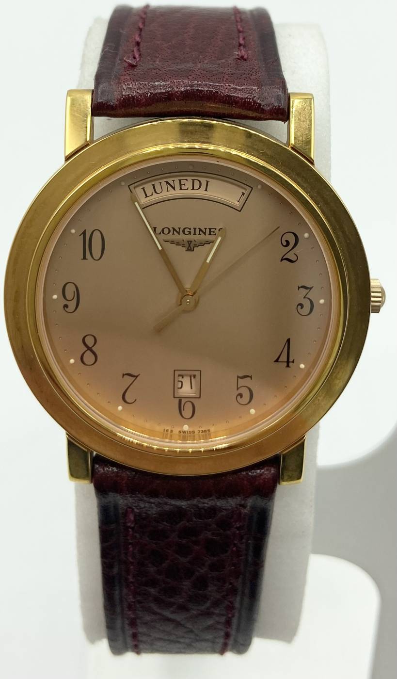 Orologio uomo Longines con cinturino in pelle e cassa in acciaio dorato. Movimento al quarzo.