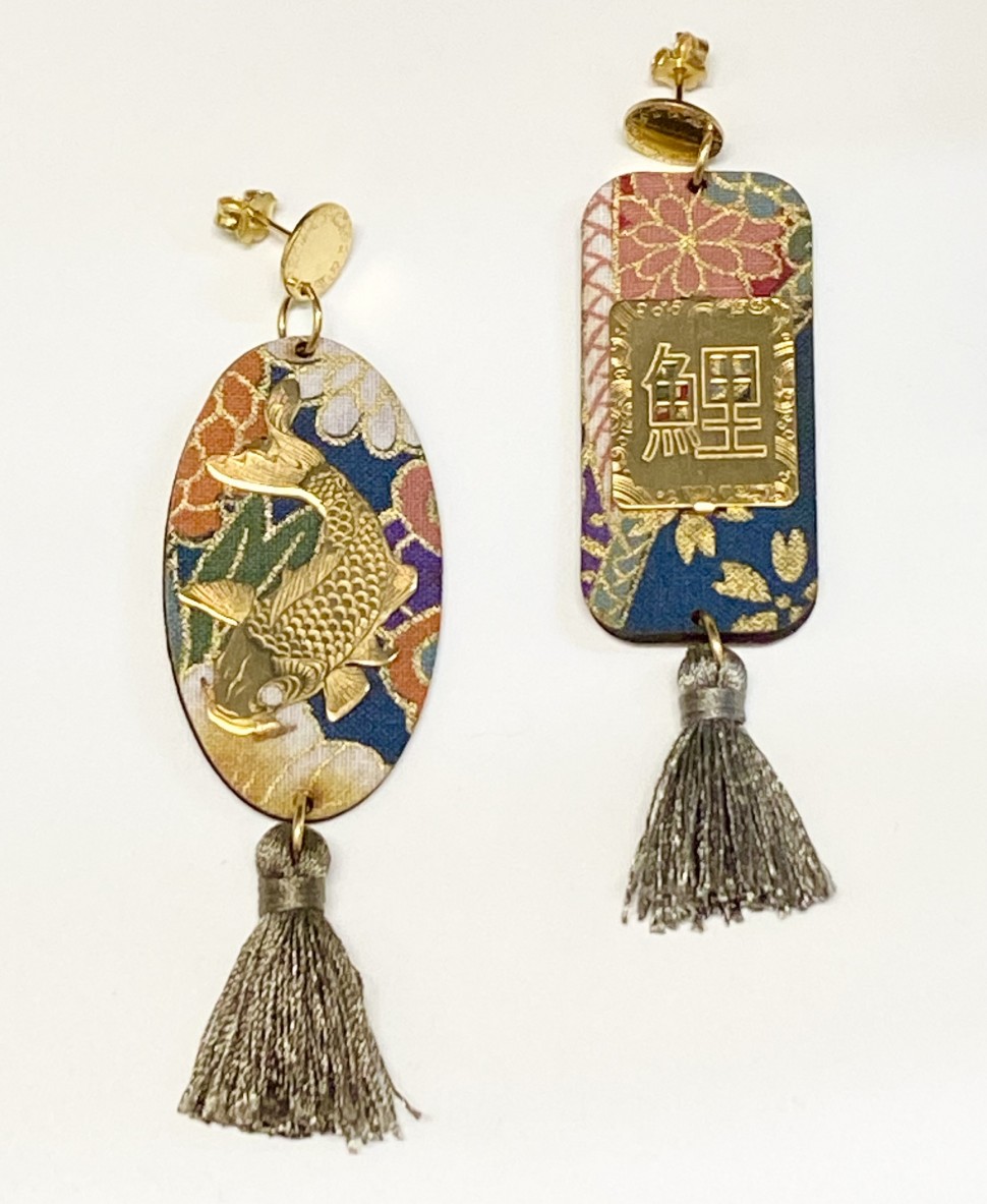 orecchino in seta giapponese con inserto carpa in argento 925 dorato e nappine in tessuto grigio