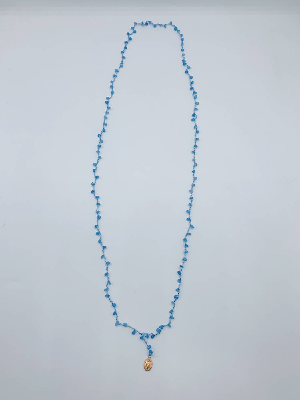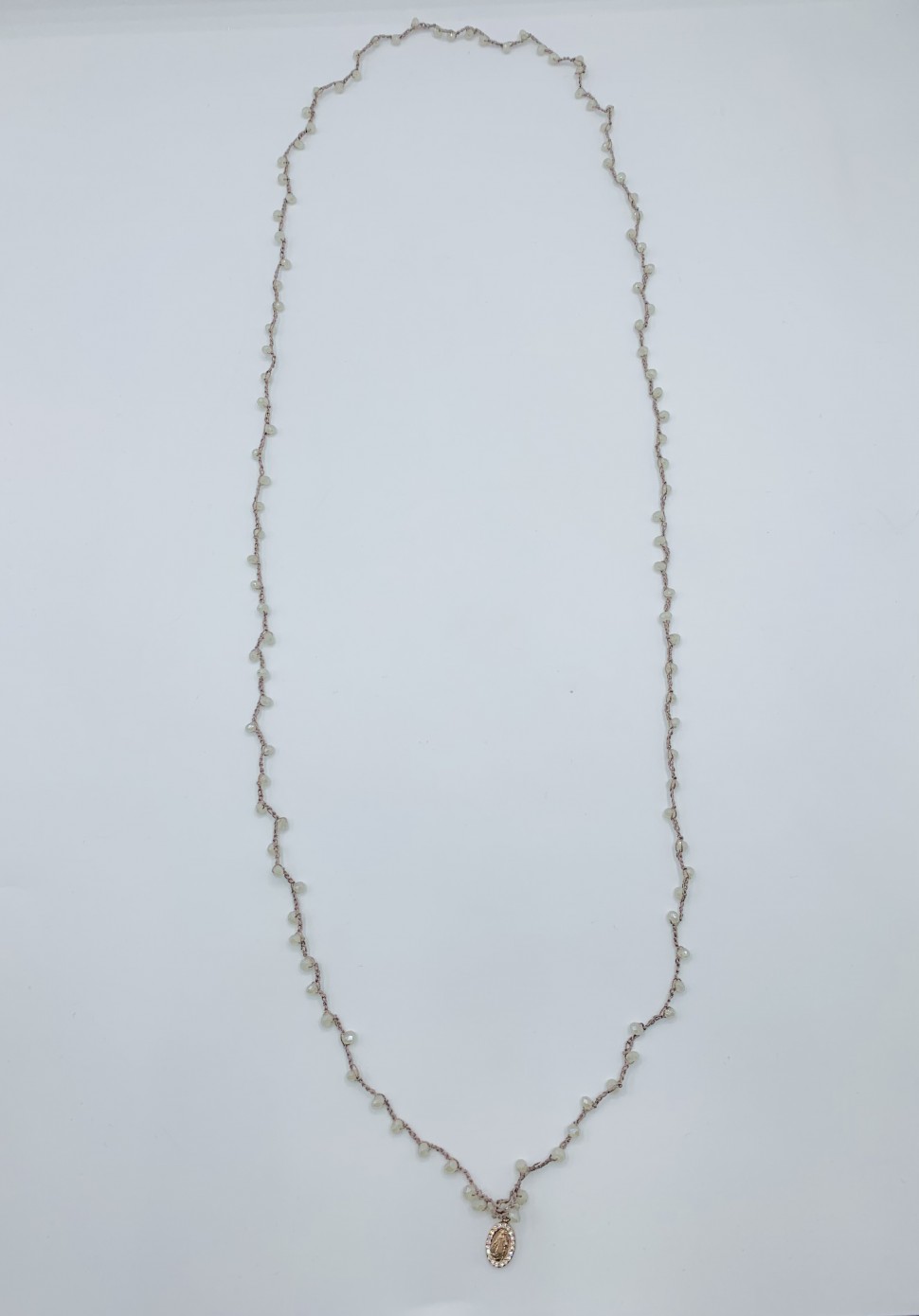 collana lunga a uncinetto con madonnina in argento e cristalli panna.