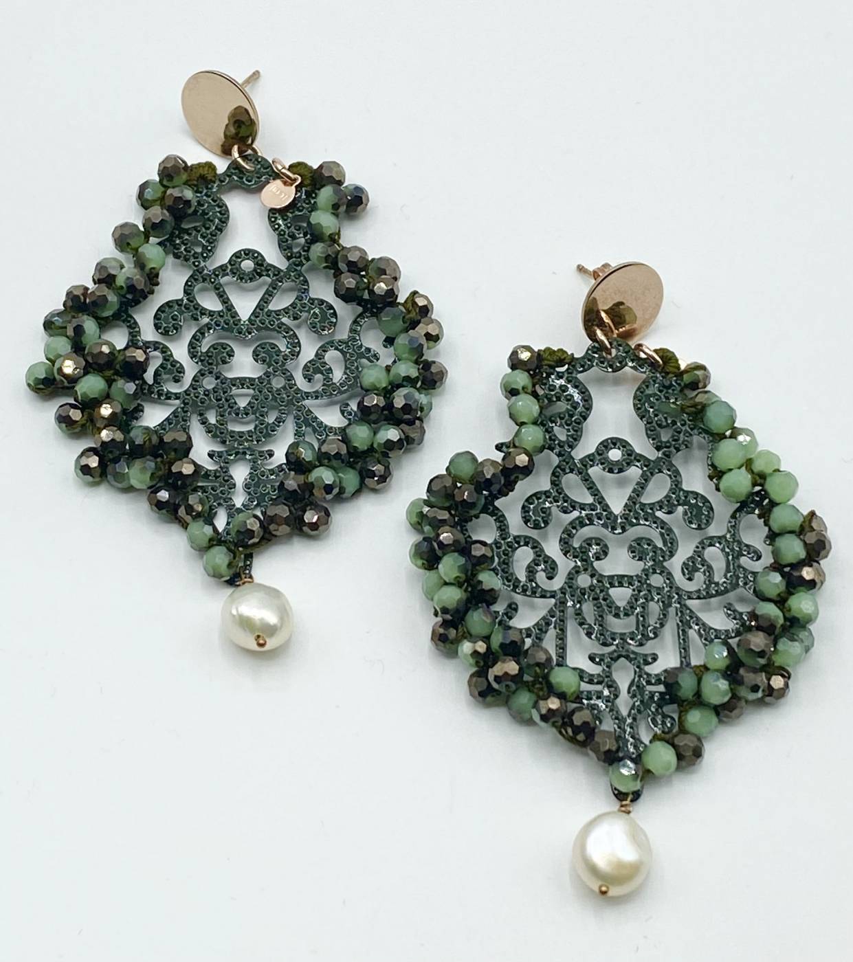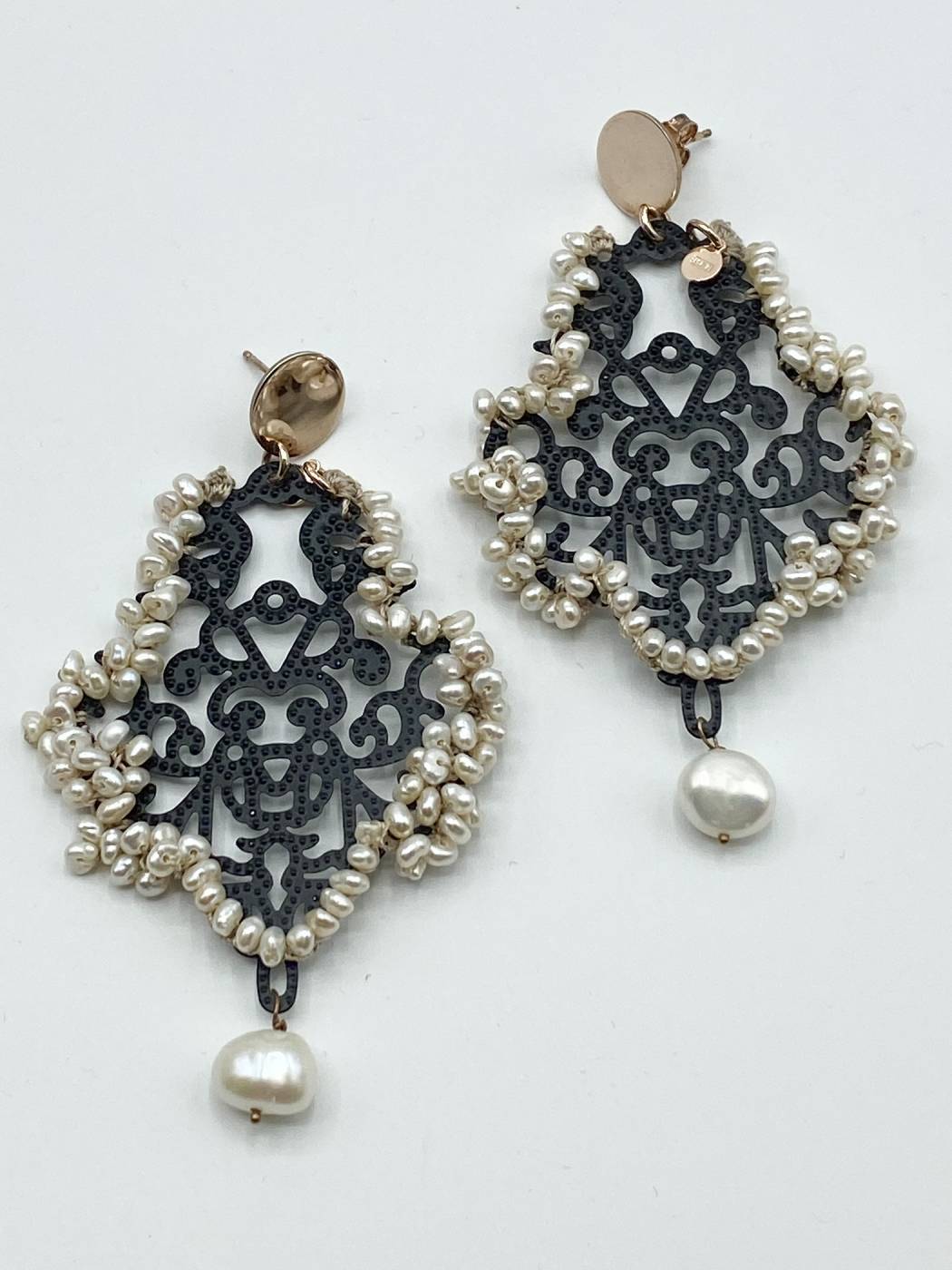 Orecchini donna Not For All, metallo traforato con pietra a goccia pendente. Lavorati ad uncinetto con perle naturali e gancio in argento 925 bagnato in oro rosa. Fatti a mano a Firenze.