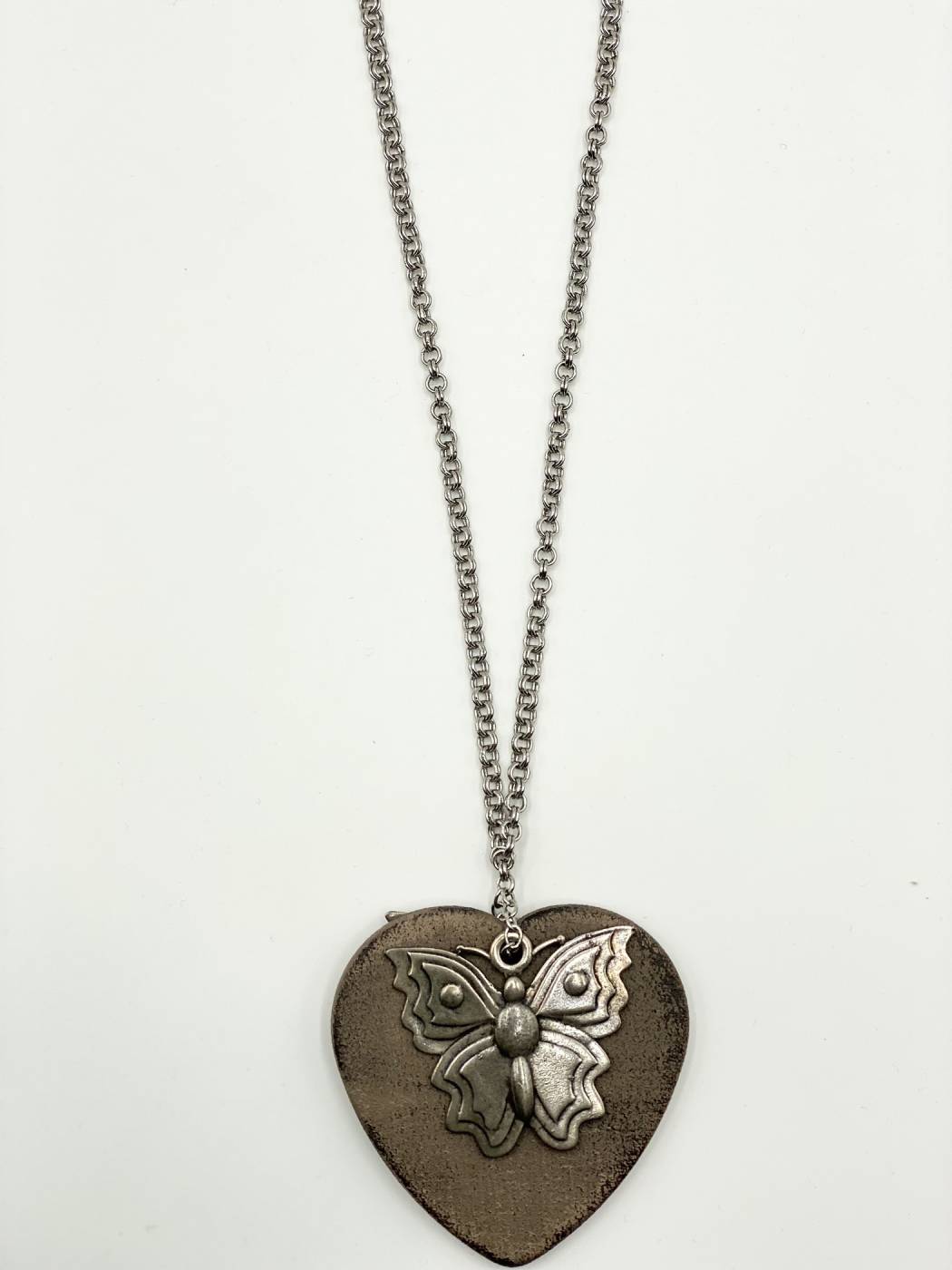 Collana donna La Griffe, lunga 100 cm, in metallo fatta a mano. La collana presenta un pendente centrale a forma di cuore, in legno, con una farfalla davanti e una dietro al cuore.