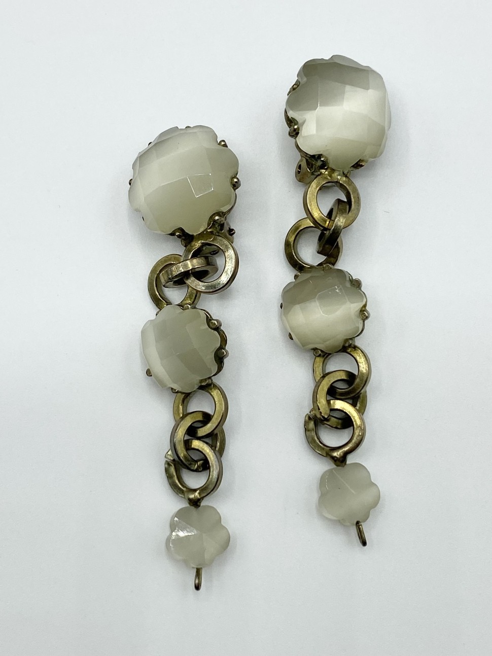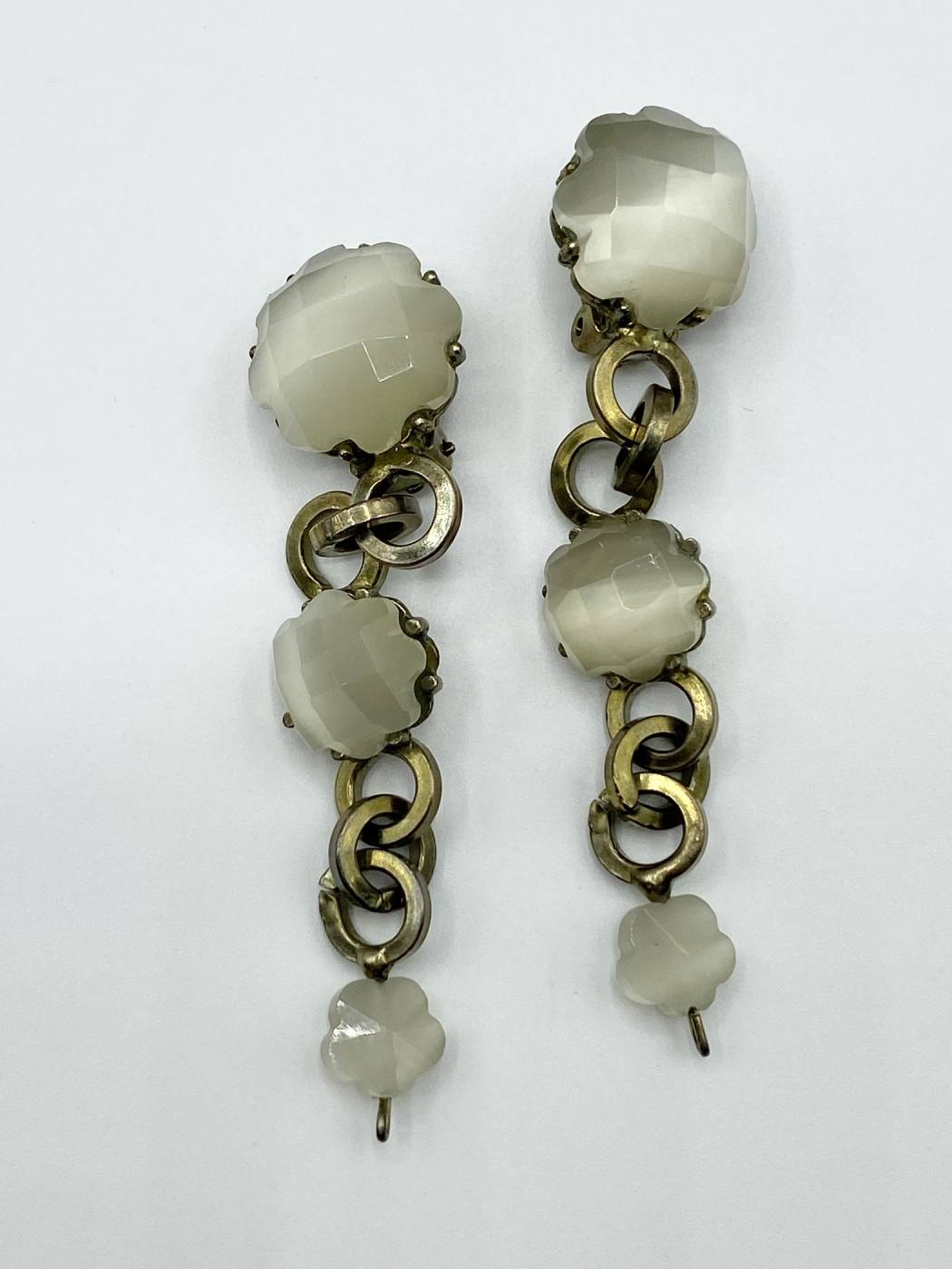 Orecchini donna La Griffe, fatti a mano, in metallo brunito verde. Con 3 fiori pendenti e chiusura a clip.