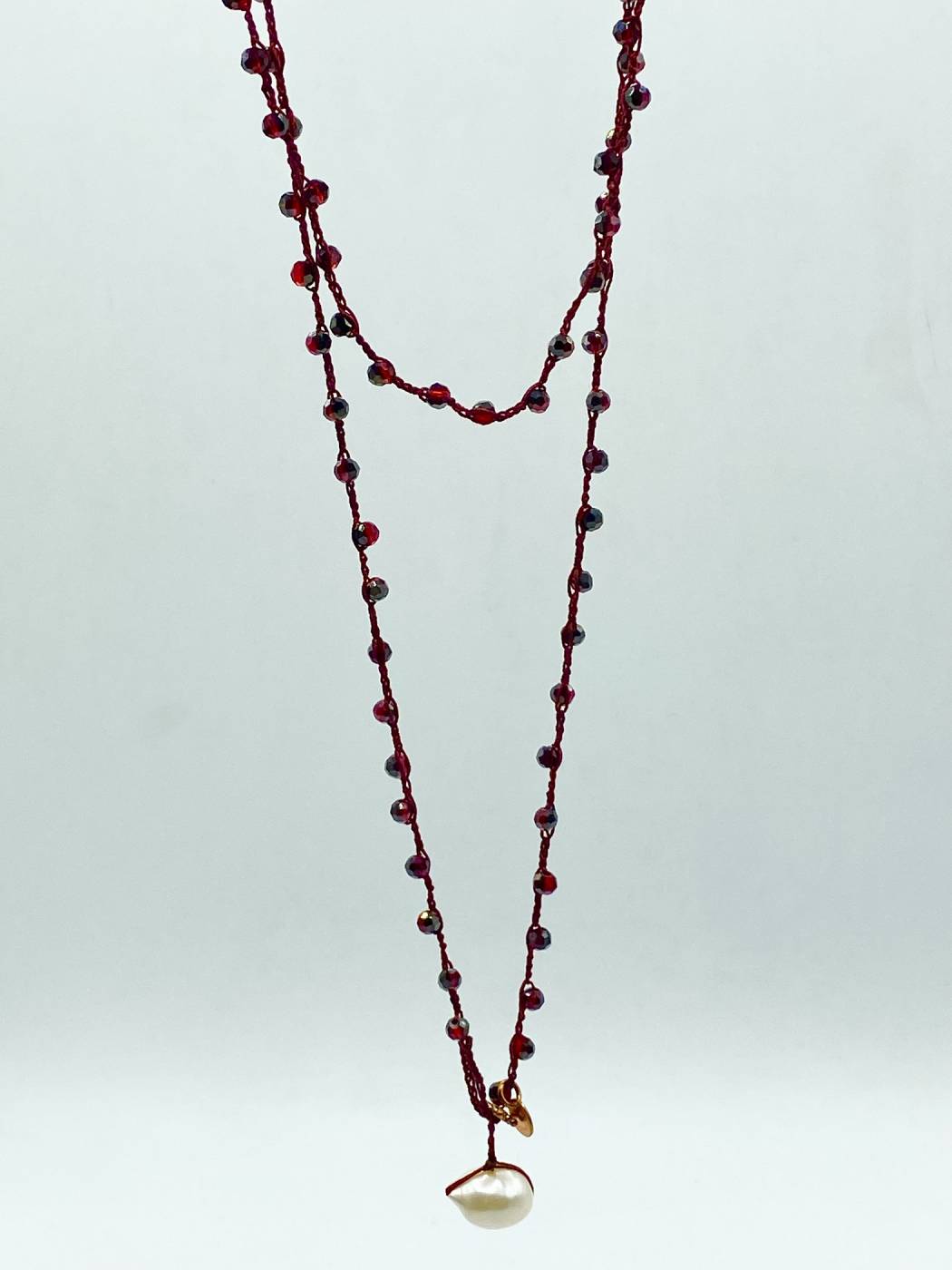 Collana donna Not For All, lunga 138 cm, lavorazione ad uncinetto bordeaux, pietre tono su tono e perla naturale. Chiusura con asola. Fatta a mano a Firenze.