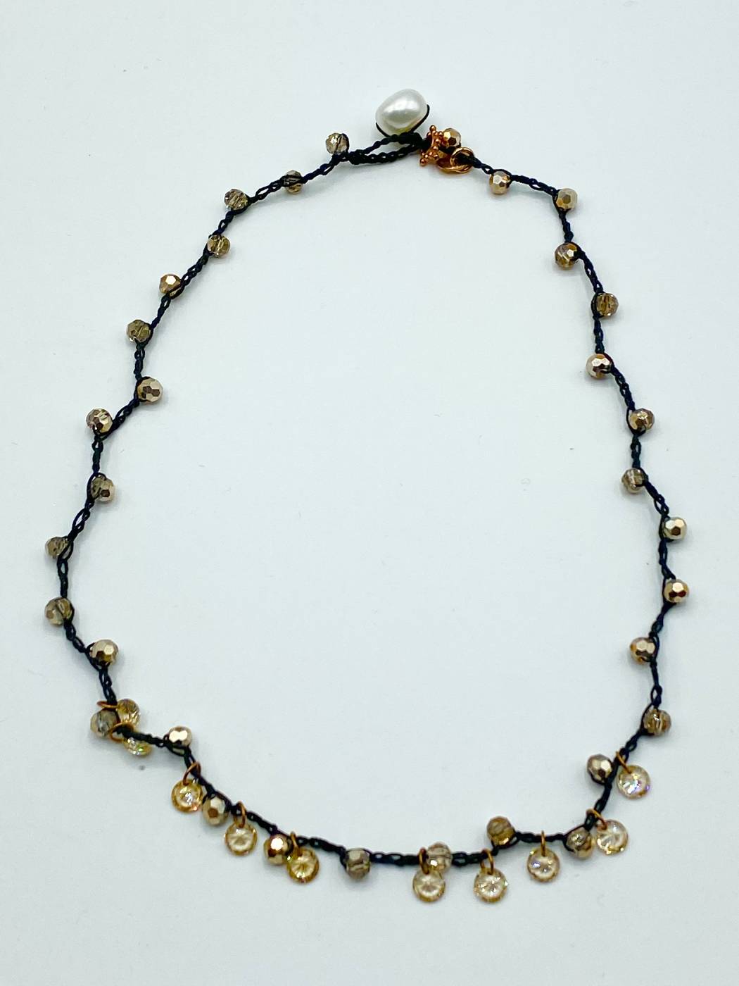 Collana donna Not For All, lunga 40 cm, con lavorazione ad uncinetto, pietre e perle naturali. Chiusura con asola. Fatta a mano a Firenze.
