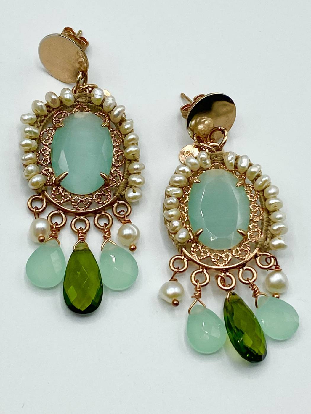 Orecchini donna Not For All, con pietre incastonate sintetiche e castoni in metallo bagnati in oro rosa. Lavorati ad uncinetto con perle naturali e gancio in argento 925 bagnato in oro rosa. Fatti a mano a Firenze