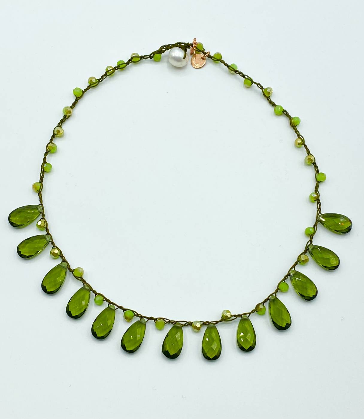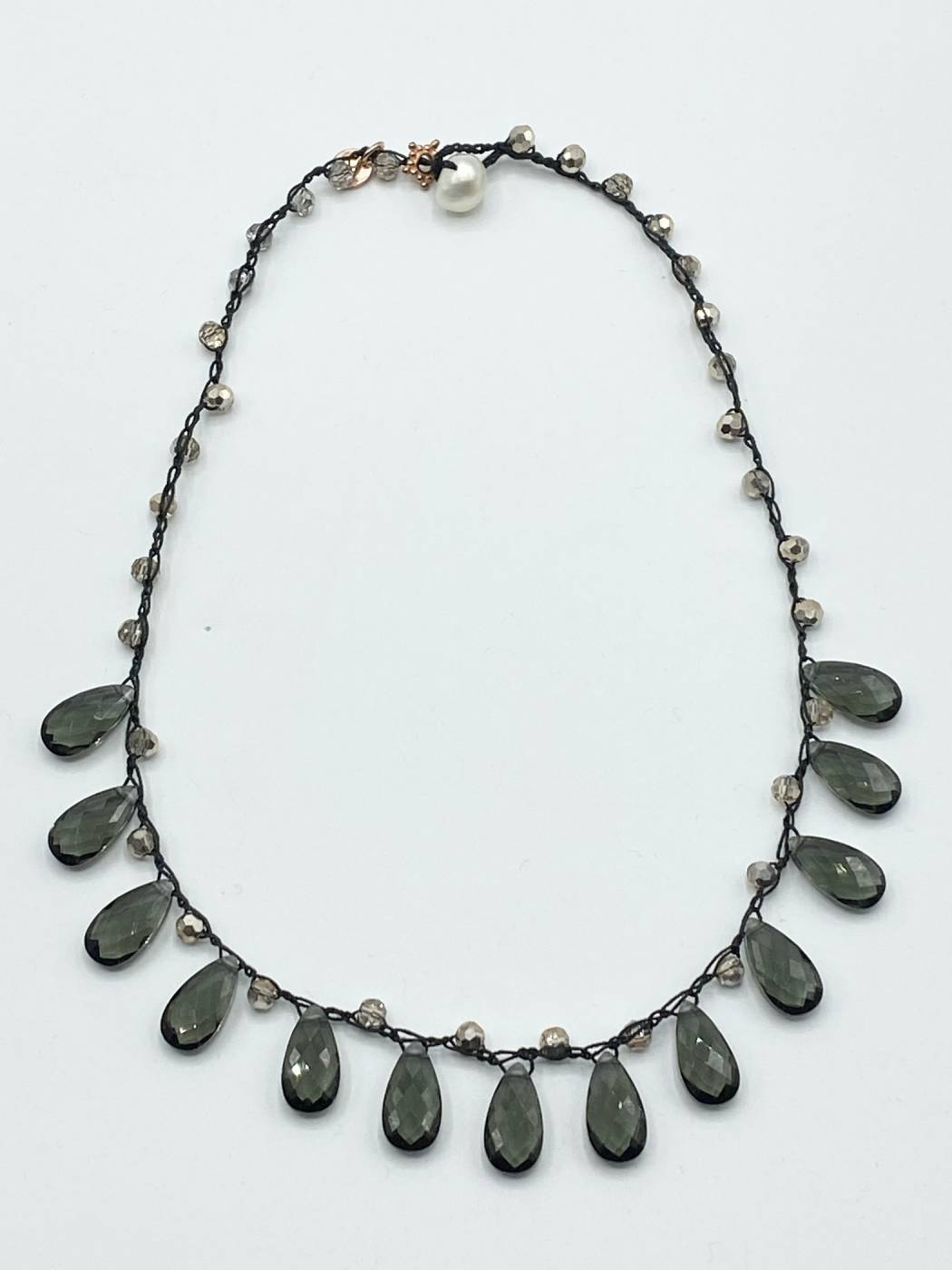 Collana donna Not For All, lunga 40 cm, lavorazione ad uncinetto con pietre sintetiche, chiusura con asola e perla naturale. Fatta a mano a Firenze.