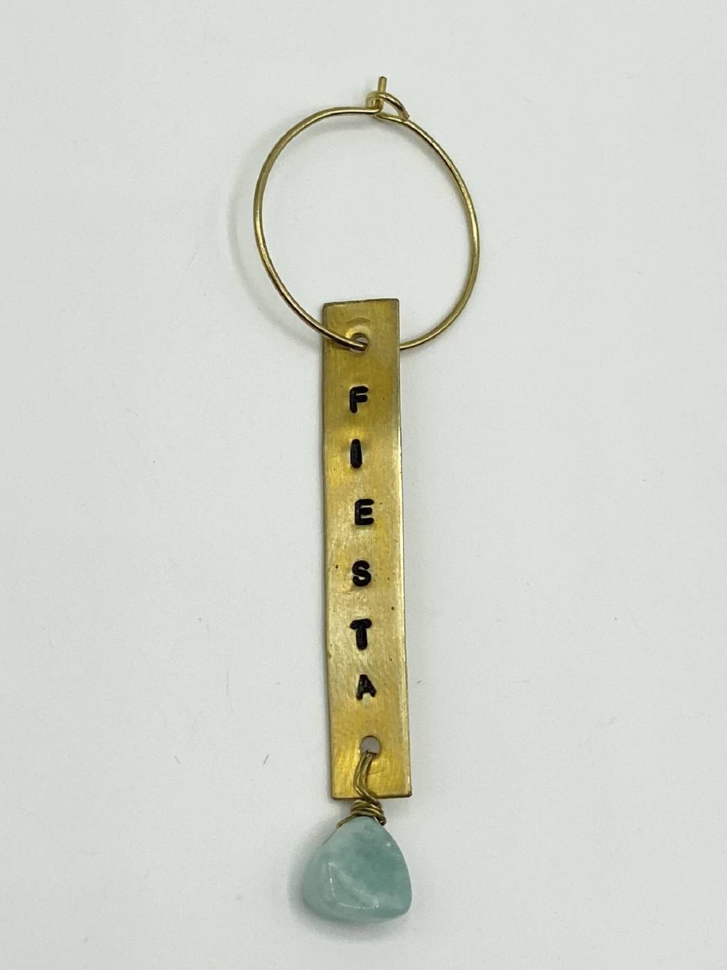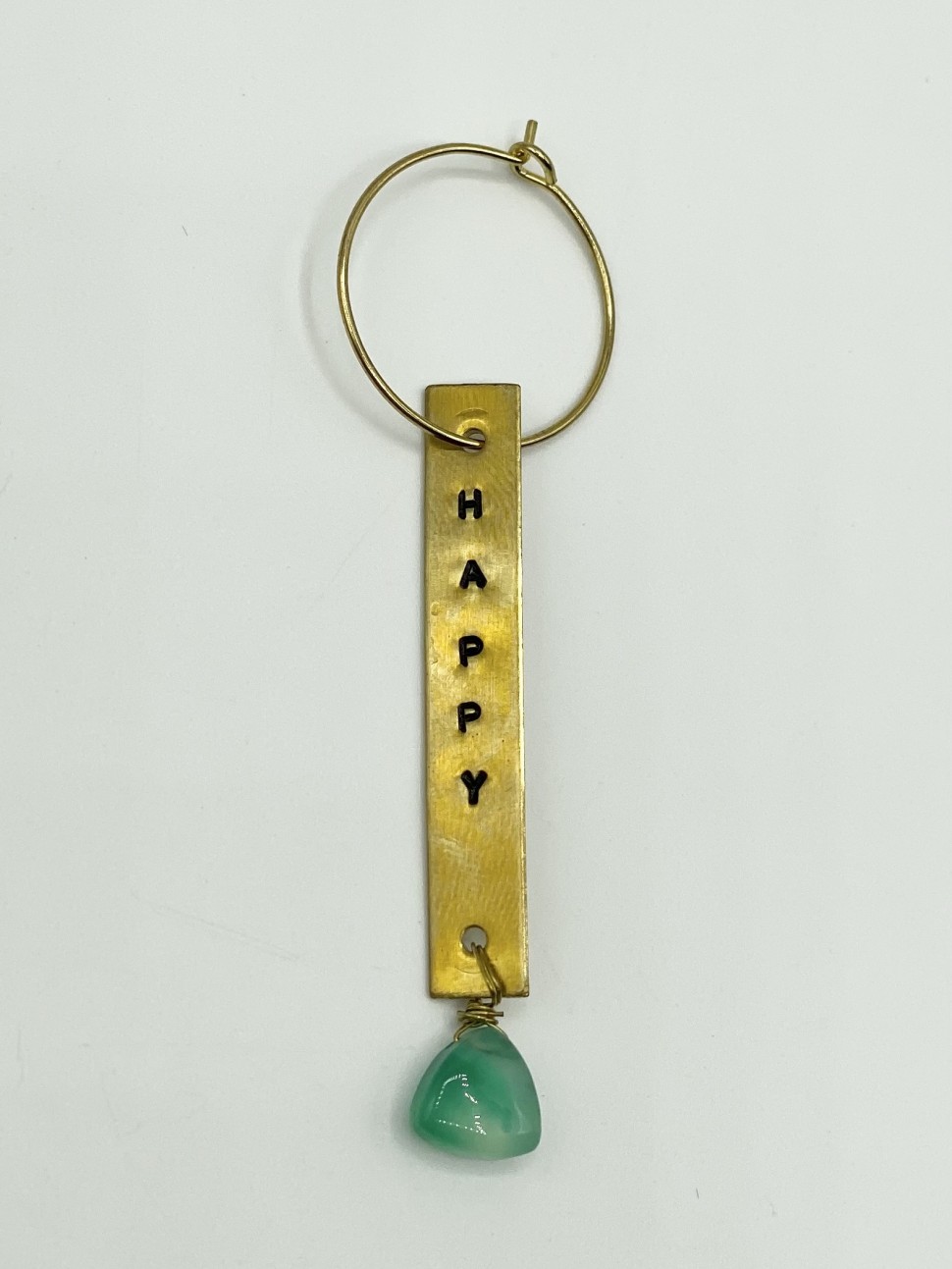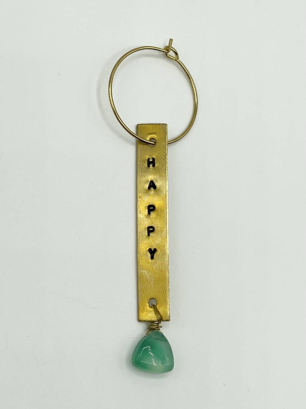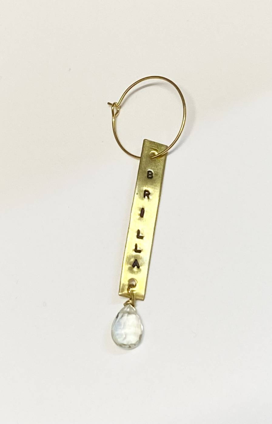 Mono orecchino donna, Fantoni in ottone dorato. L'orecchino si compone di un cerchietto con lastra rettangolare pendente e una pietra colorata a forma di goccia. Disponibile con diverse incisioni.