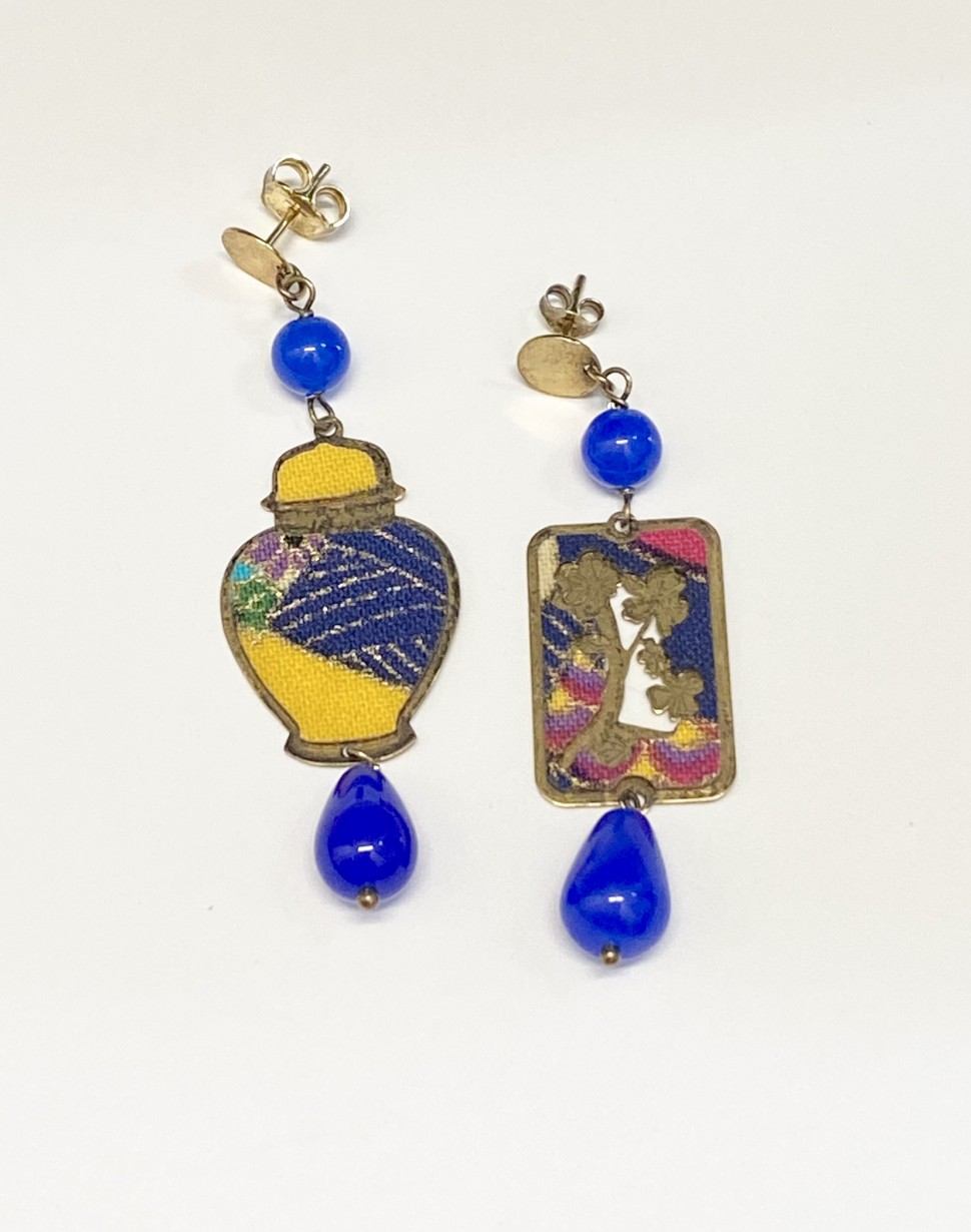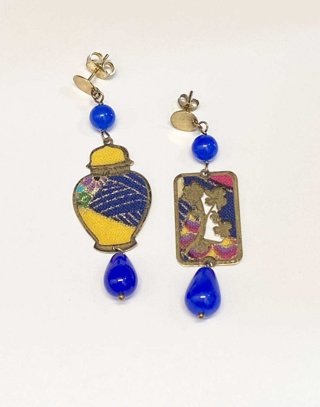 Orecchini donna Lebole in ottone galvanizzato oro, pietre naturali e sete di antichi Kimono giapponesi stese su una leggerissima anima di legno.