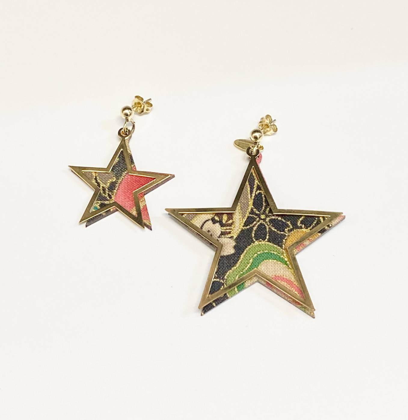 Orecchini donna Lebole composti da elementi in argento galvanizzato oro e sete giapponesi stese su una leggerissima anima di legno.