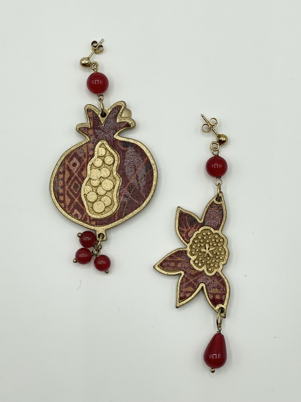 Orecchini donna Lebole composti da elementi in argento galvanizzato oro, pietre naturali e sete indiane incassate in una cornice di legno dorata.