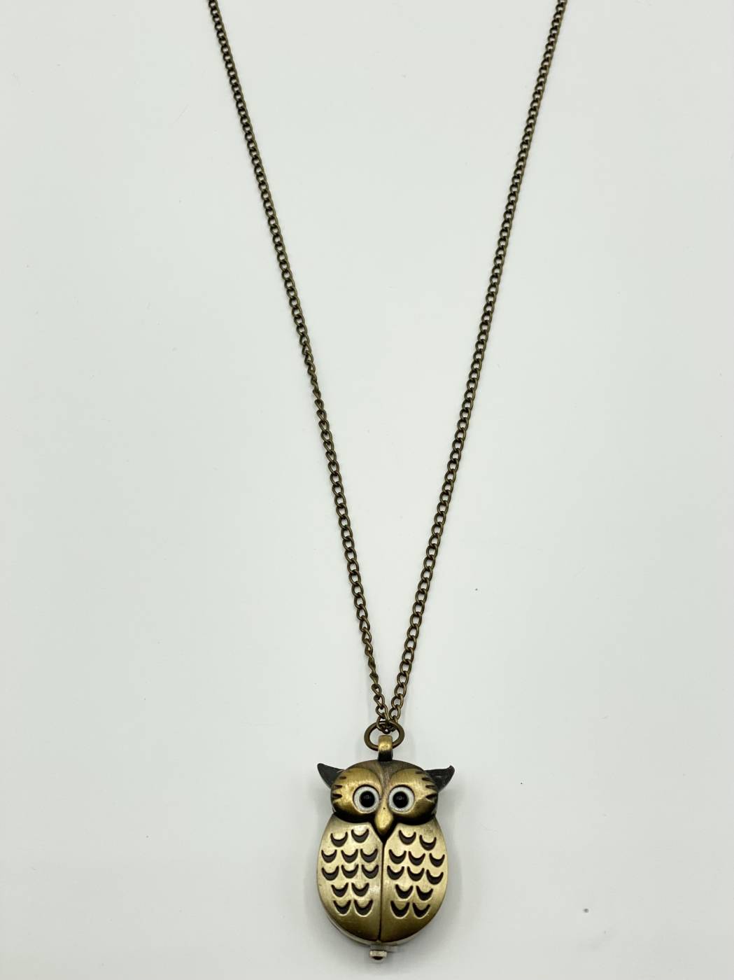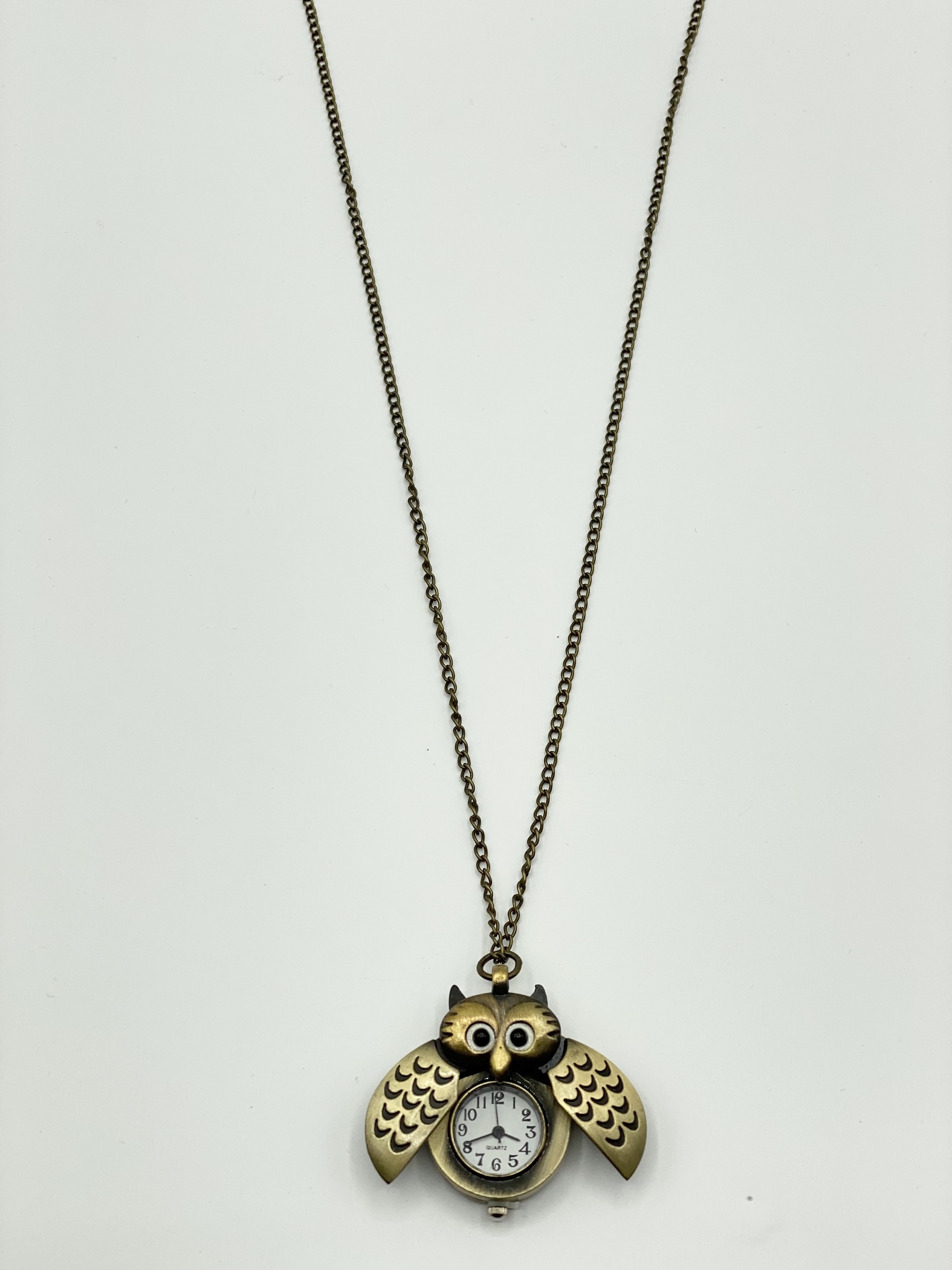 Collana orologio, lunga 80 cm, in ottone con gufetto. Apertura attraverso le ali.