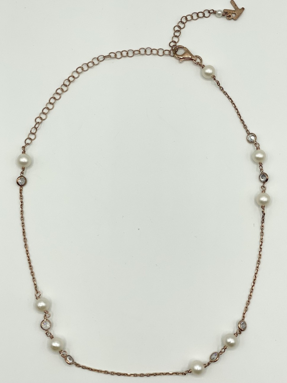 Collana donna, lunga 43 cm, Kikilia. In argento 925 bagnato oro rosa, zirconi e perle fresh water.