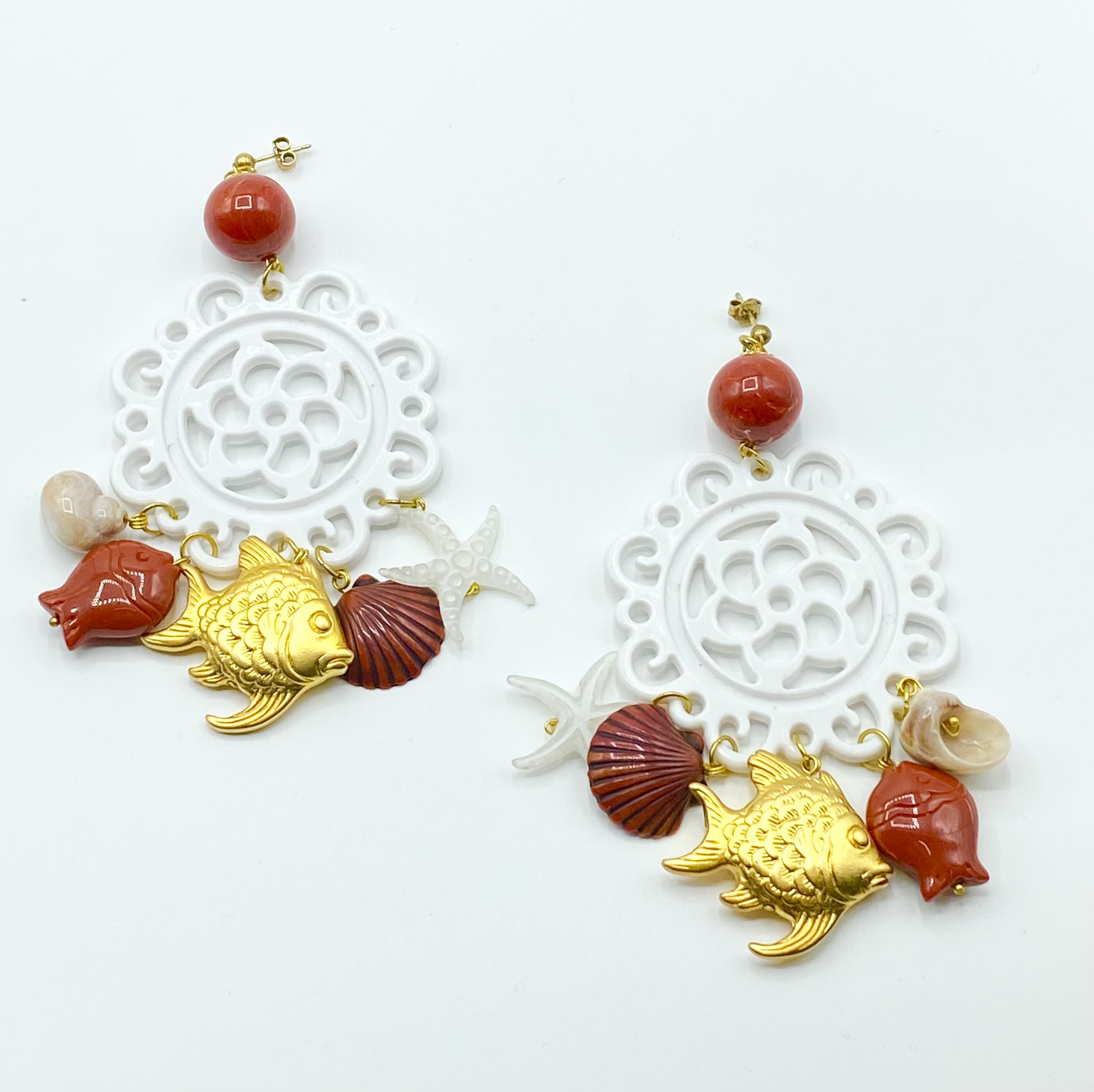 Orecchini donna Pepità con dettagli in metallo dorato, pesci e conchiglie pendenti.