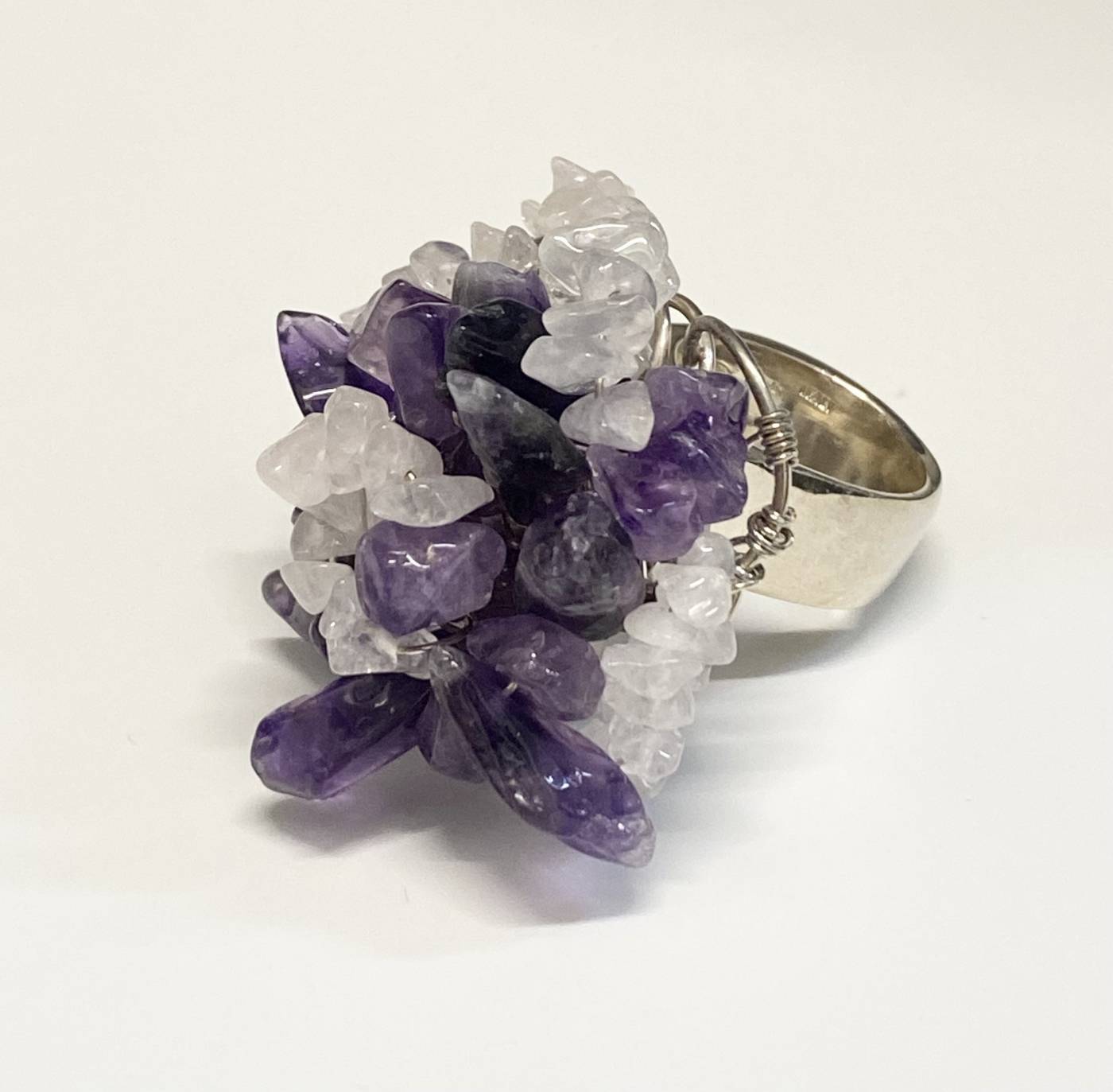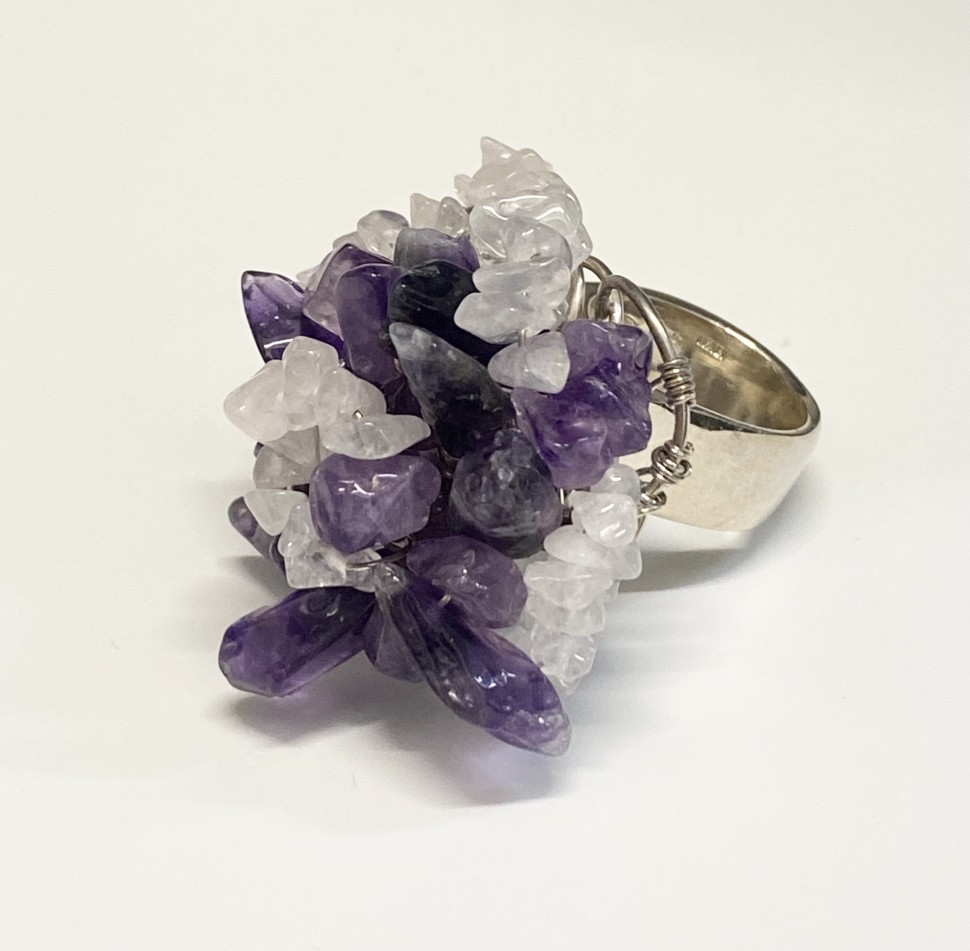 Anello donna Omnia fatto interamente a mano in argento 925, con ametista e quarzo rosa.
