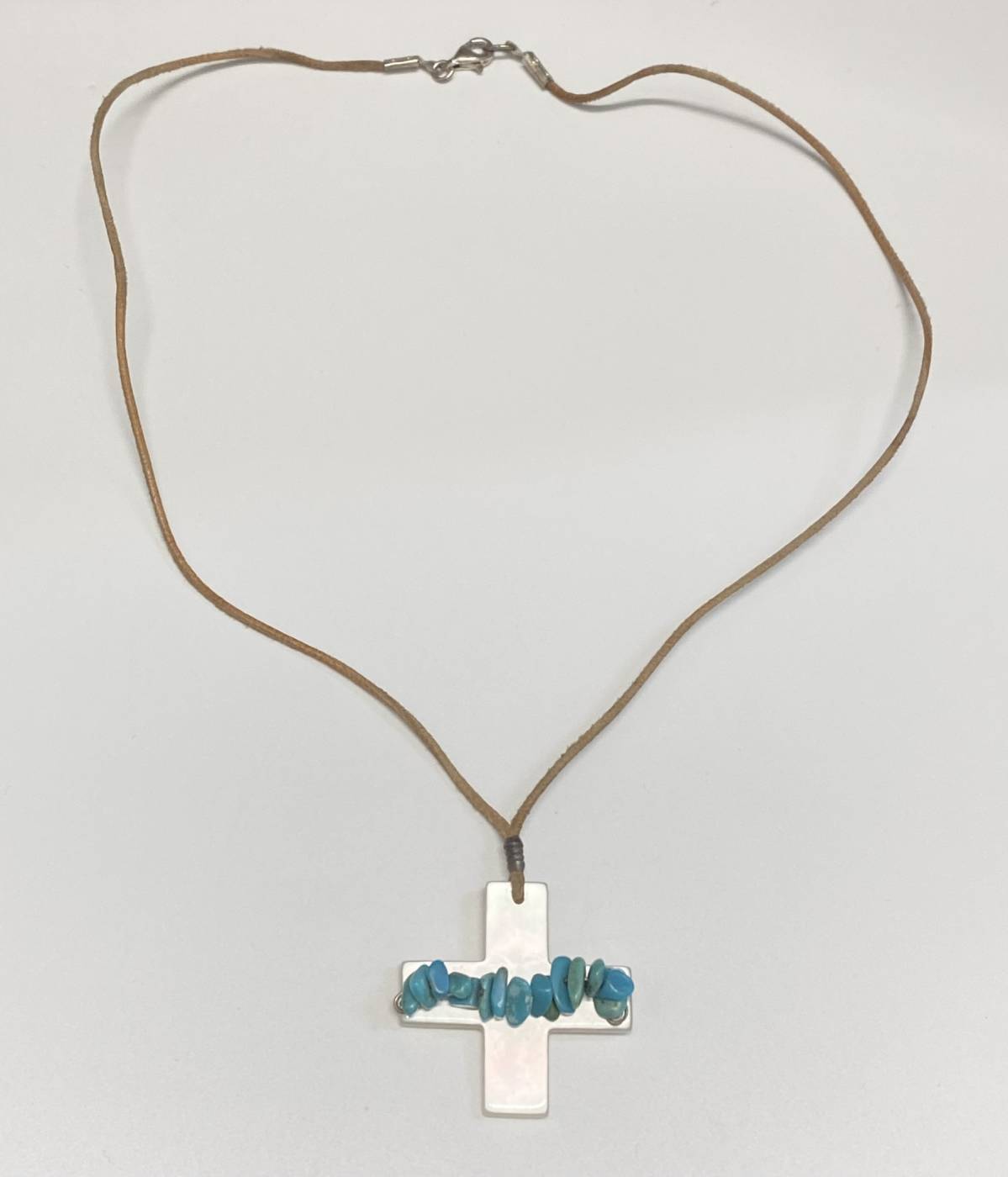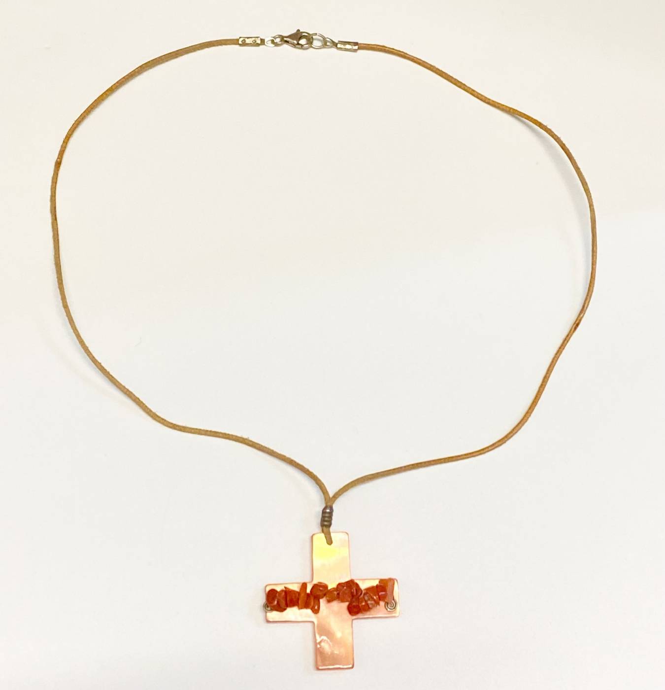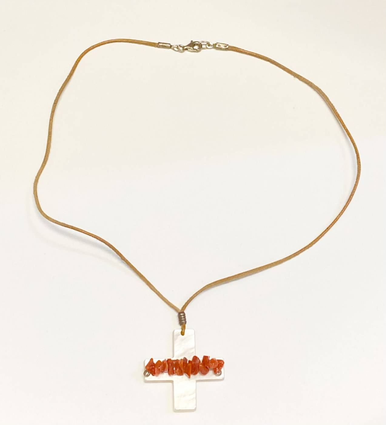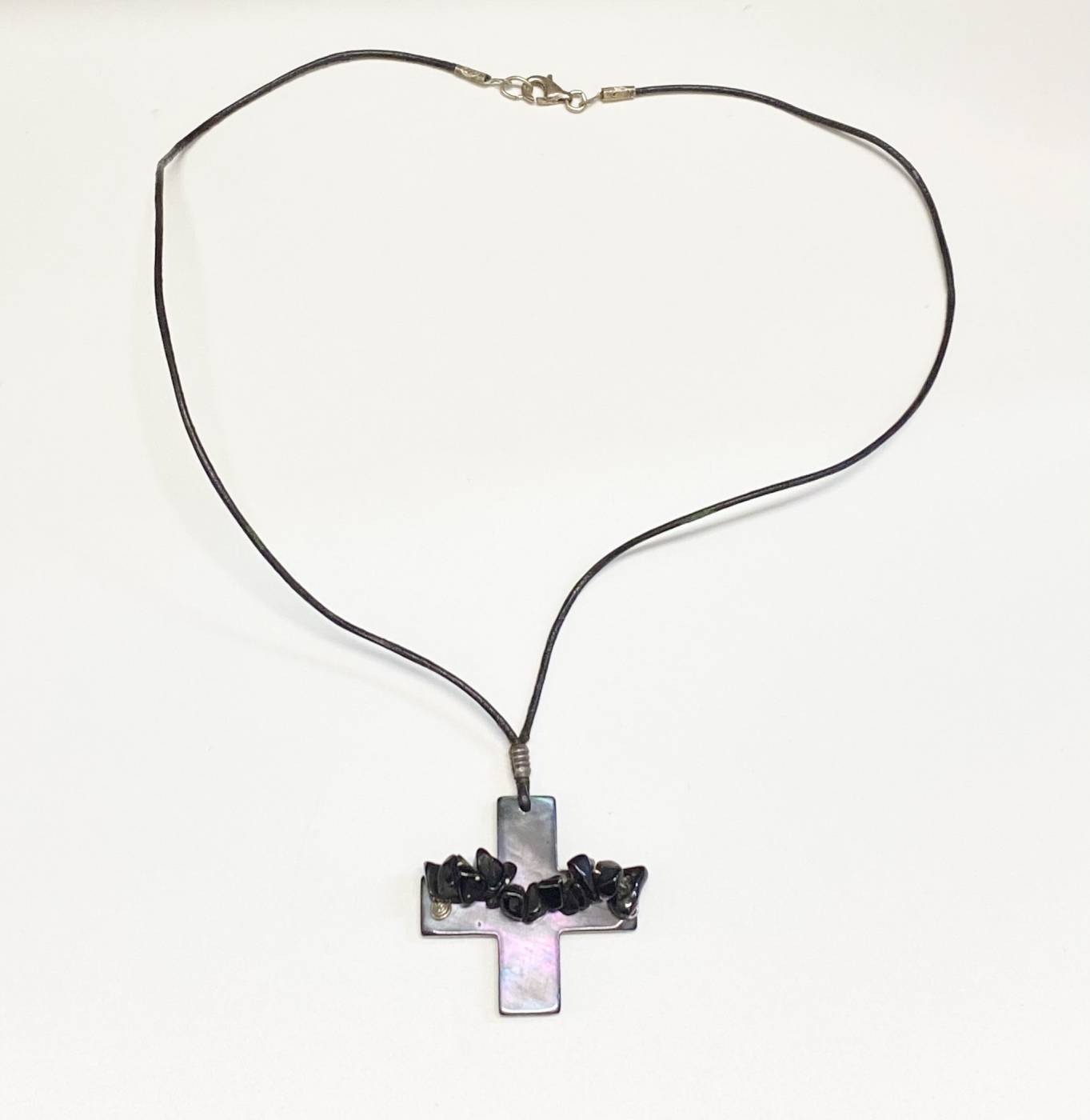 Collana donna, lunga 44 cm, Omnia. Fatta interamente a mano con cordino in tessuto e chiusura in argento 925, croce in madreperla e pietre naturali.