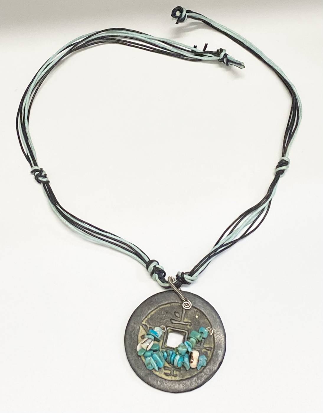 Collana donna, lunga 42 cm, Omnia. Fatta interamente a mano con cordino regolabile, dettagli in argento 925 e turchese sul pendente.