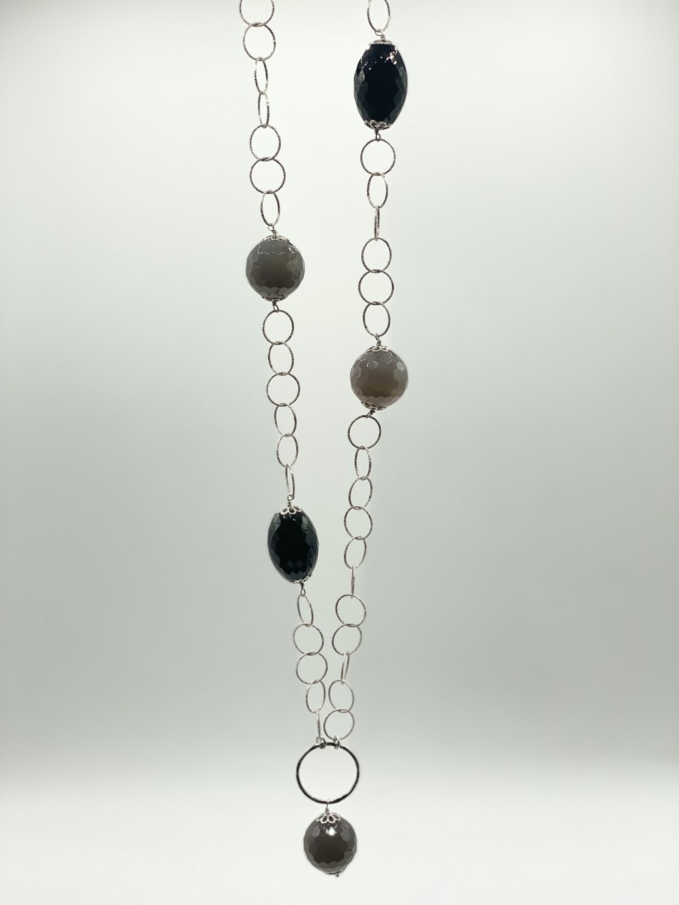 Collana donna, lunga 86 cm, fatta interamente a mano in argento 925 con onice e quarzo grigio.