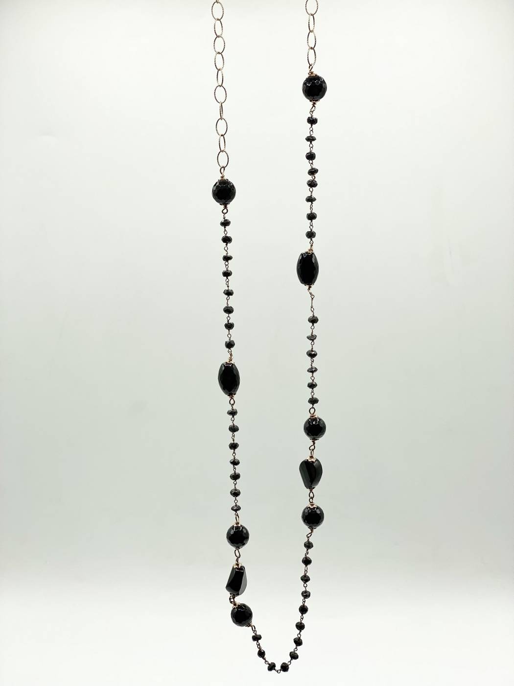 Collana donna, lunga 87 cm, fatta interamente a mano in argento 925 bagnato oro e onice.