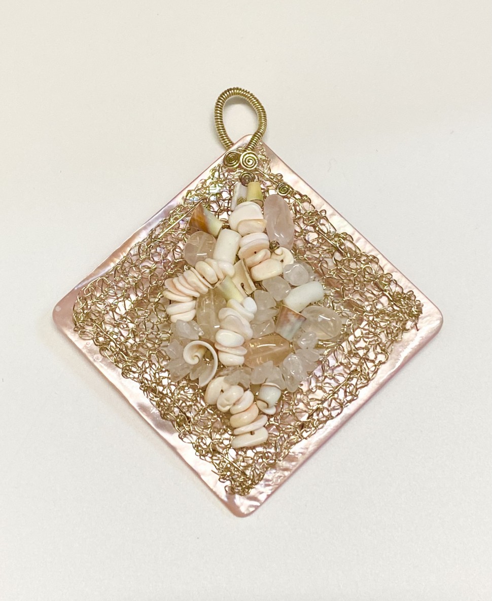 Pendente donna Omnia fatto interamente a mano con madreperla, argento 925 e quarzo rosa.