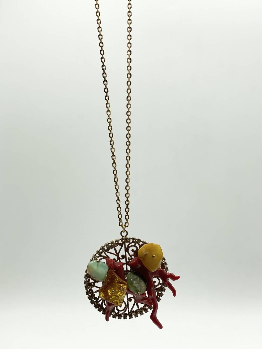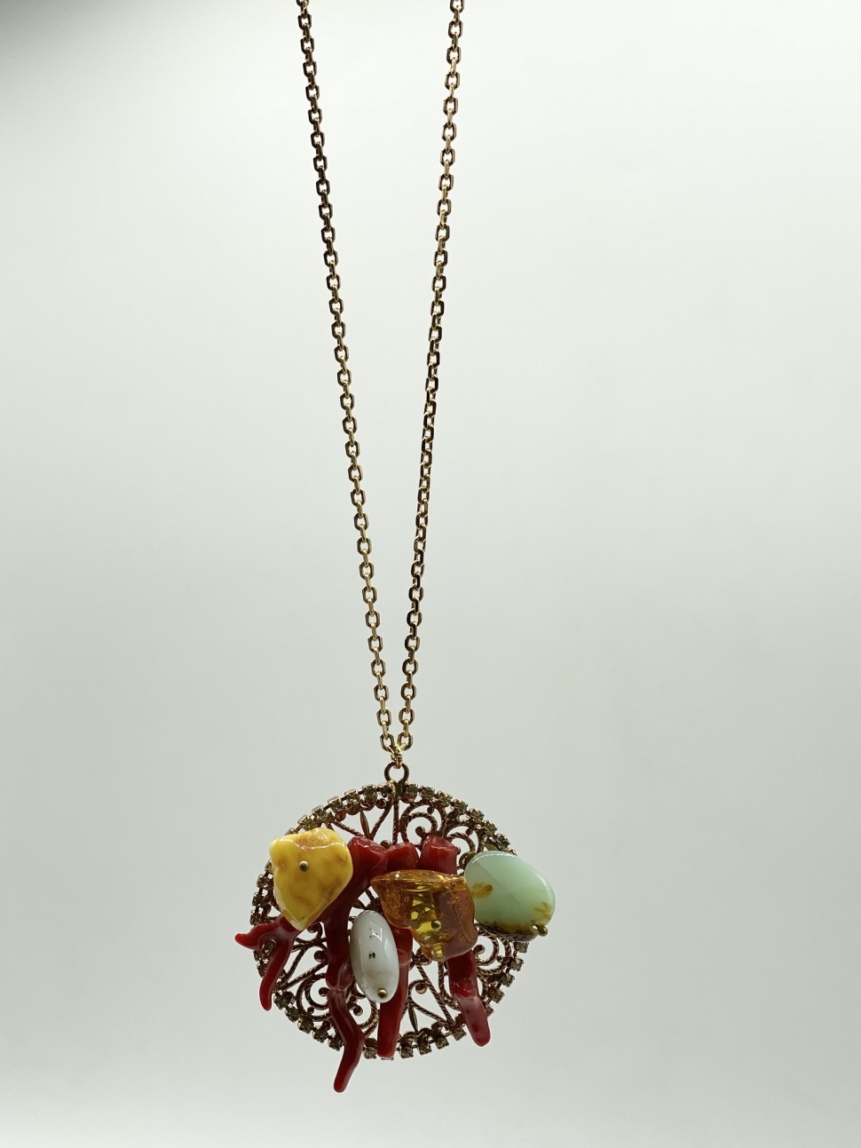 Collana donna, lunga 86 cm, Fatta a mano in metallo dorato. Con riproduzione di coralli e pietre sintetiche.