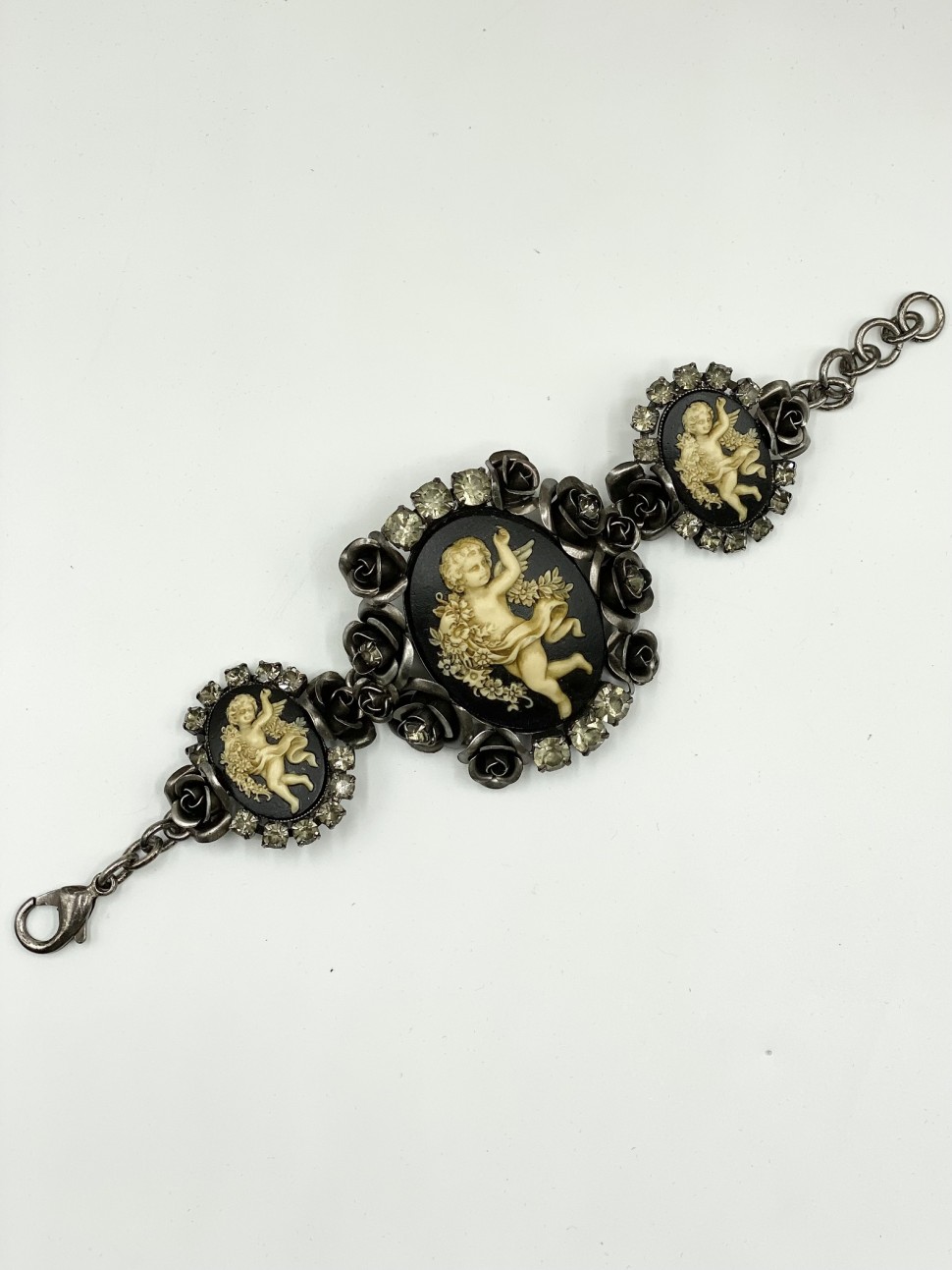 Bracciale donna in ottone brunito, con riproduzione di cammei con angelo e zirconi neri.