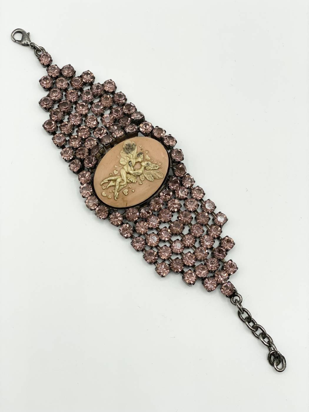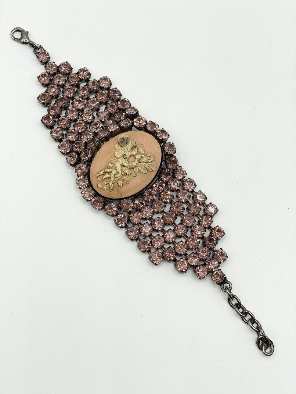Bracciale donna in ottone brunito, con riproduzione di cammeo con fate e zirconi rosa.