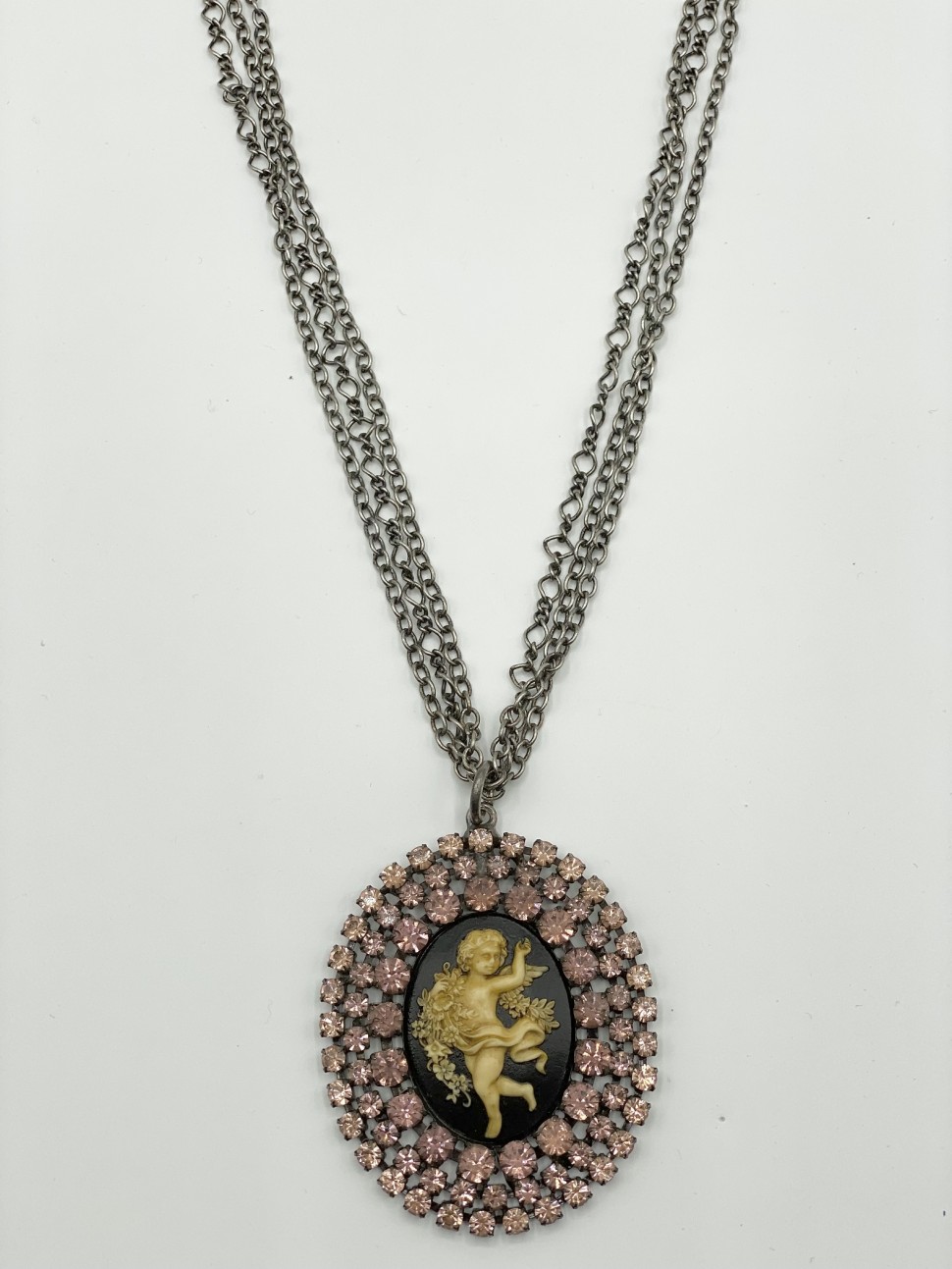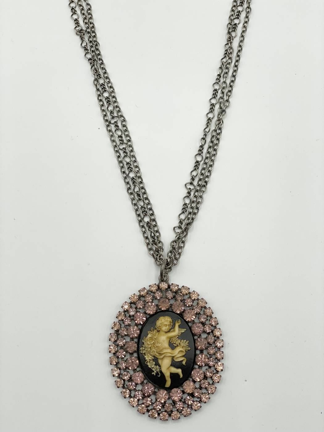 Collana donna in ottone brunito, con riproduzione di cammeo con angelo e zirconi rosa.