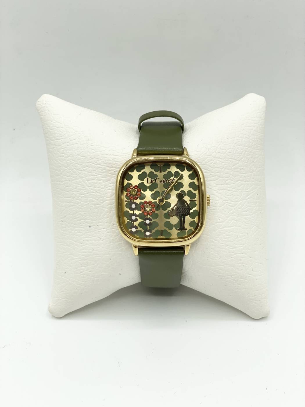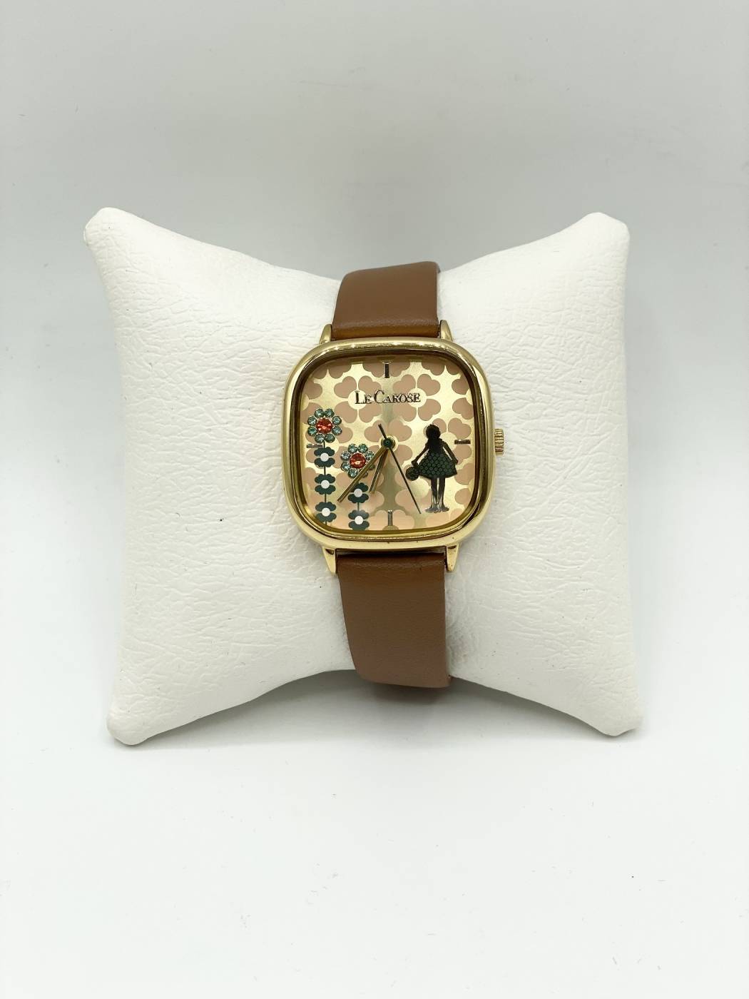 Orologio Carose con cinturino in pelle marrone, cassa dorata e quadrante fantasia.