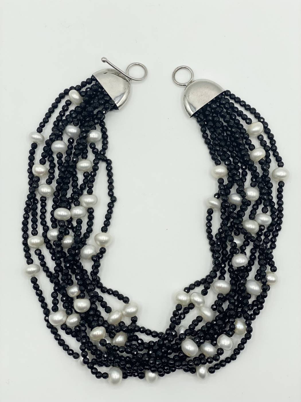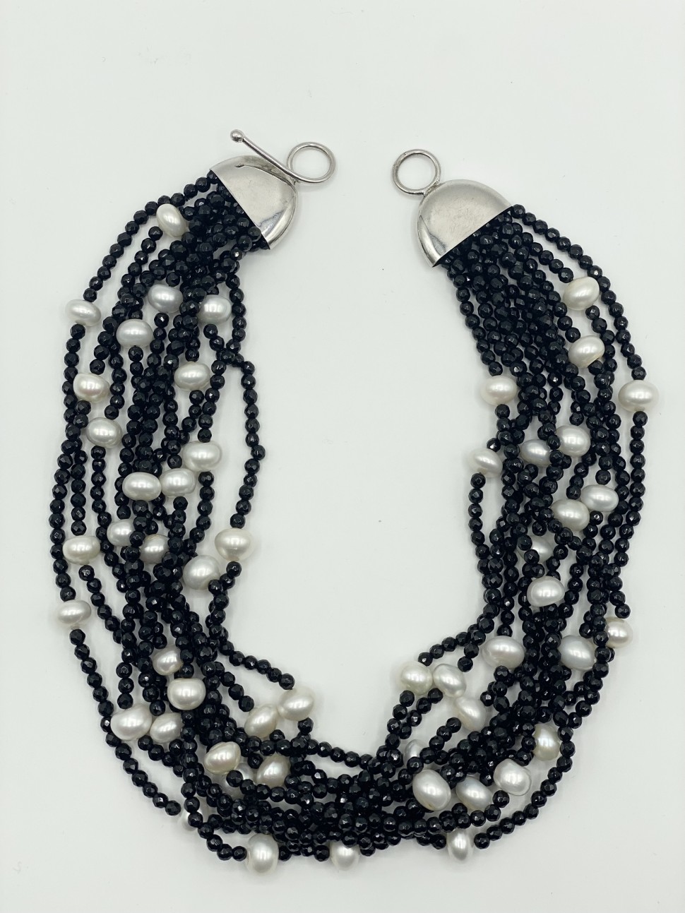 Collana donna, lunga 46 cm, fatta interamente a mano in argento 925 onice e perle naturali.