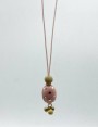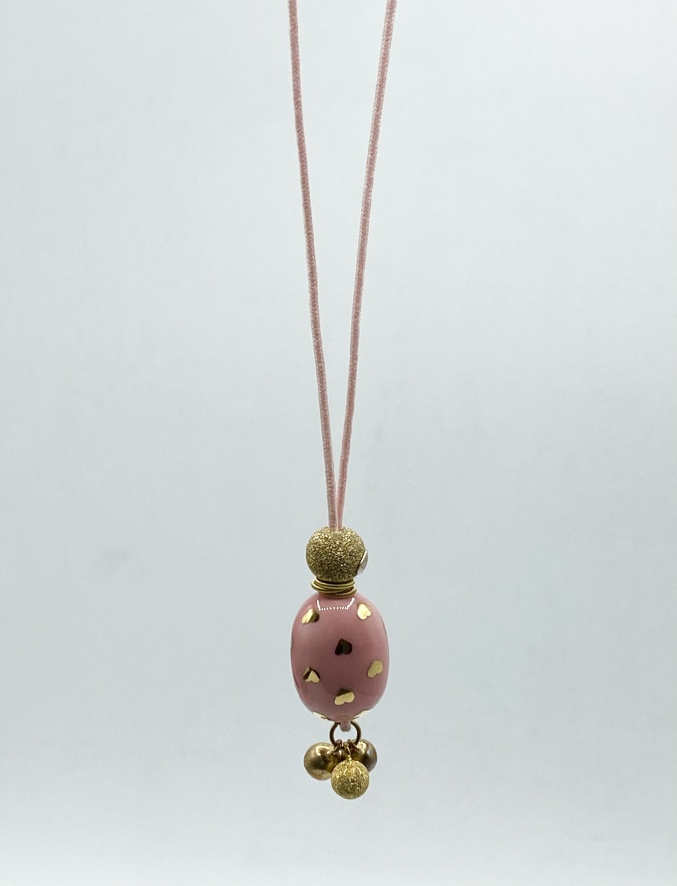 Collana donna, lunga 46 cm, fatta interamente a mano con cordino e dettagli in argento 925 bagnato oro e pepite smaltate rosa e oro.